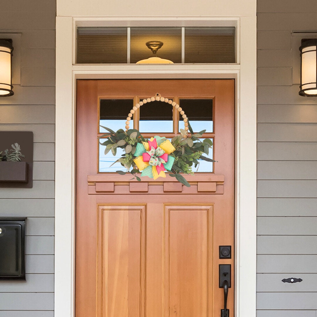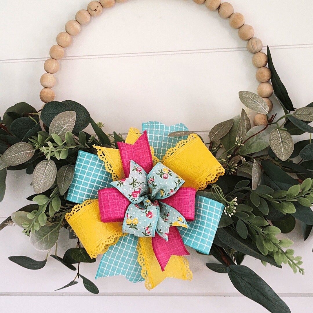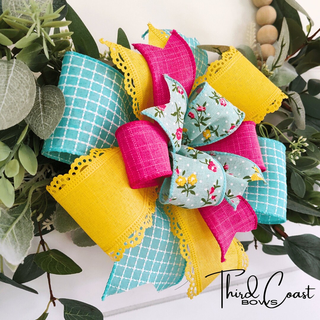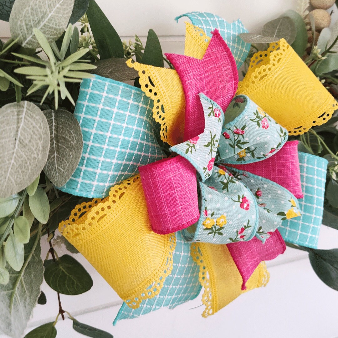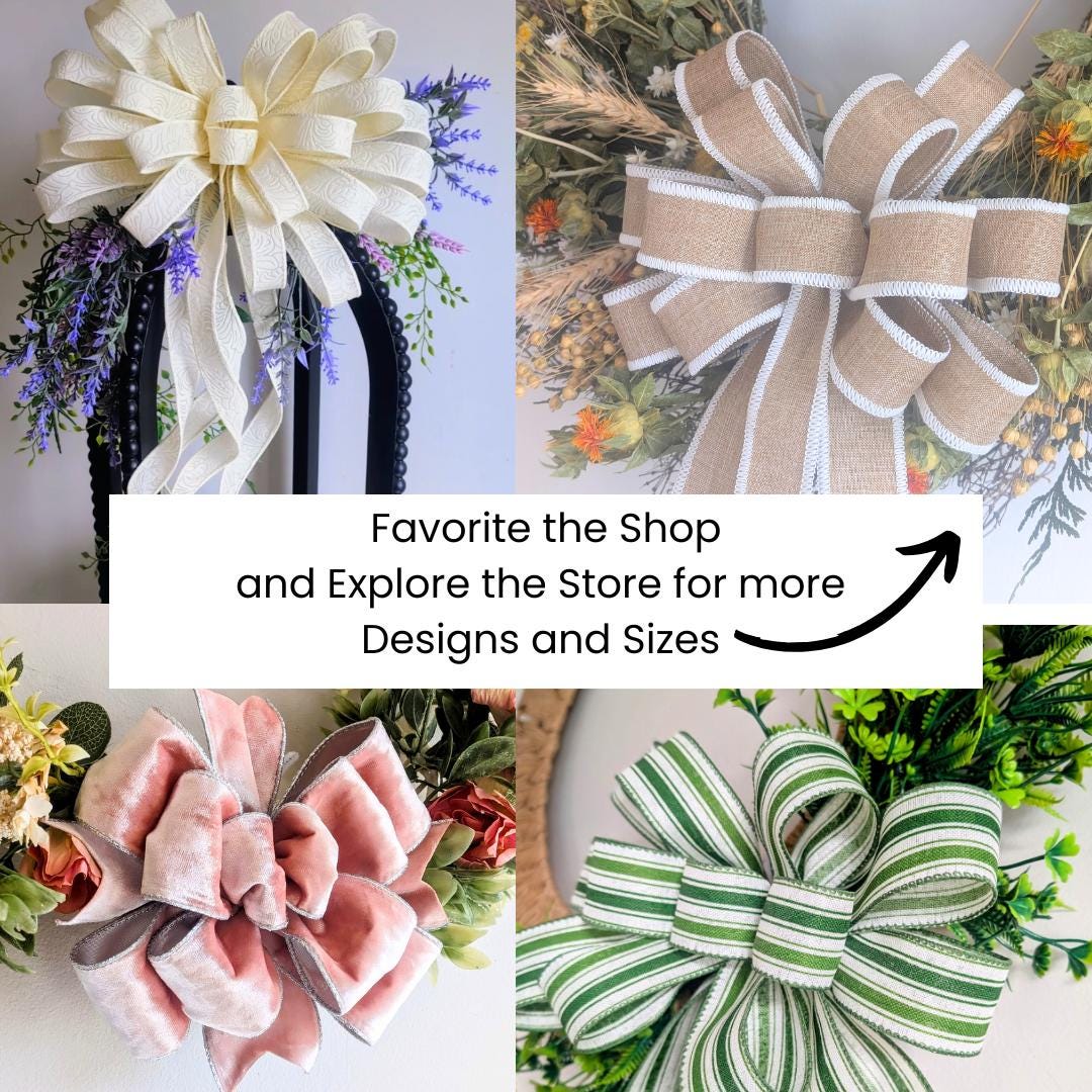8x8in Round Bow, made with 2.5in and 1.5in wired ribbons. This size is ideal for wreaths 12in-17in. Easter baskets and lanterns 12in and up. Your bows come with chenille pipe-cleaners for scratch-free attachment and are thoughtfully shipped in a storage box. Shipping is included. This bow is recommended for indoor/covered areas.