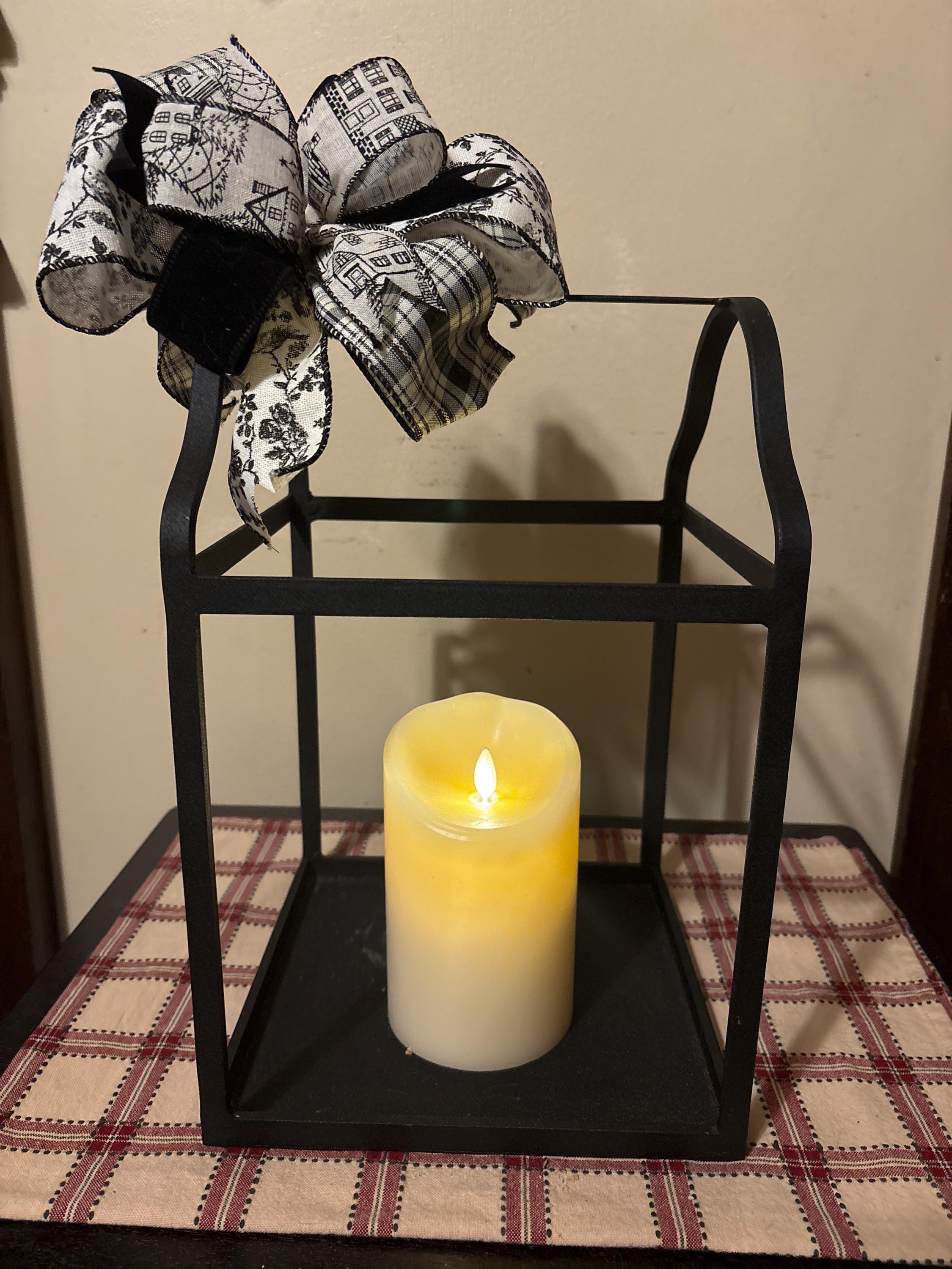 Description: Black Velvet and soft/warm white/cream/ivory linen Chinoiserie Print, Plaid Print, Floral Toile Print Christmas Chinoiserie Themed / Toile Wreath Bow / Lantern Bow