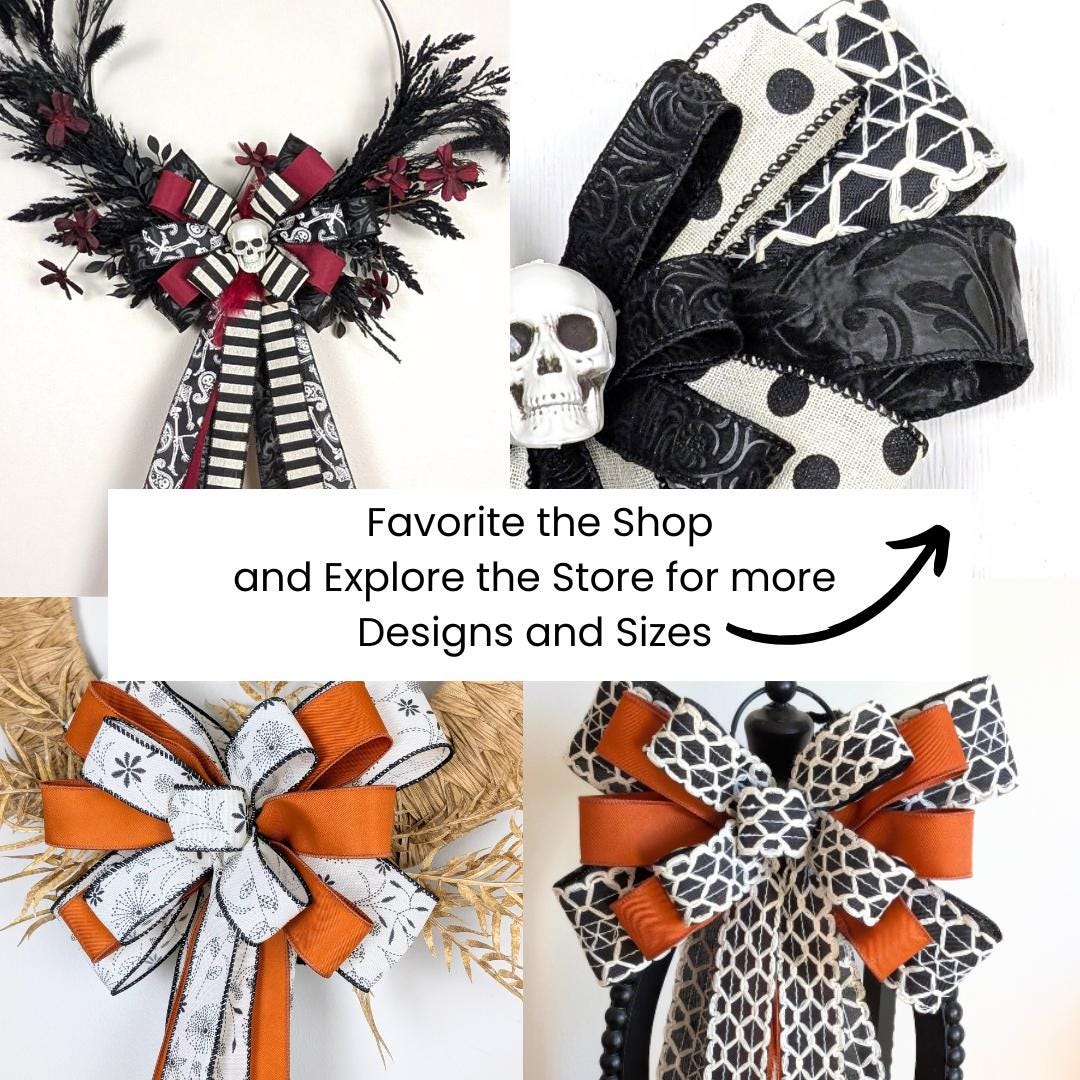 Pretty! A hint of Halloween, a hello to Fall with Pumpkin Orange and Black/White embroidered Linen. This bow measures approx 10in wide, with the longest tails approx 20in, overall 10x24in. This is a great size for wreaths 20in and up, and lanterns 24in and up. The ribbon has some weight from the embroidery and is lightly wired throughout, no edge wires. It hangs beautifully. It does not curl.