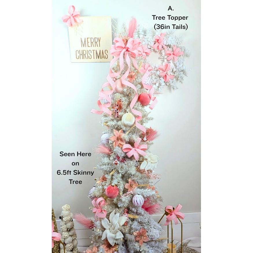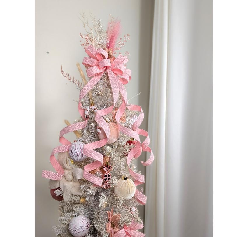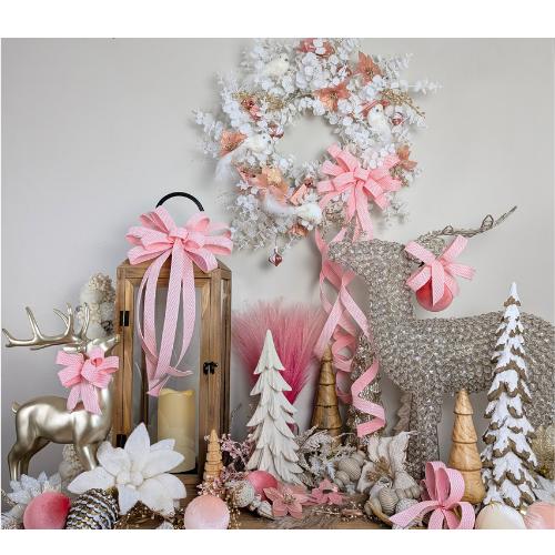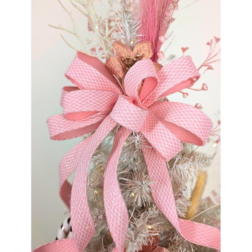 Gorgeous 1-inch wired Pink Glitter Print (white geometric/silver glitter has minimal flaking) is the ideal enhancement for a soft and bright pastel palette, and beautifully complements various styles. This timeless fabric features a sturdy wire that ensures it remains in place when styled. The accent bows serve as a delightful addition for any tree, garland, railing, swag, or decor! They are an excellent way to create harmony across multiple areas or rooms, resulting in a cohesive aesthetic.
