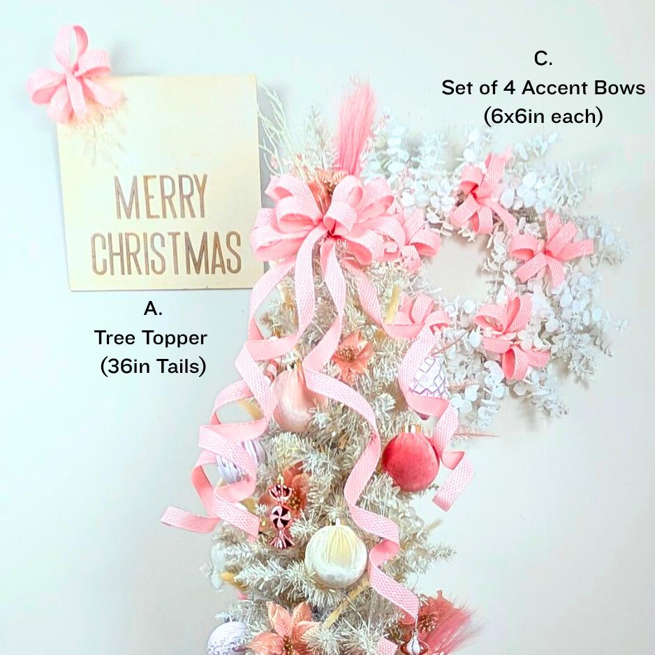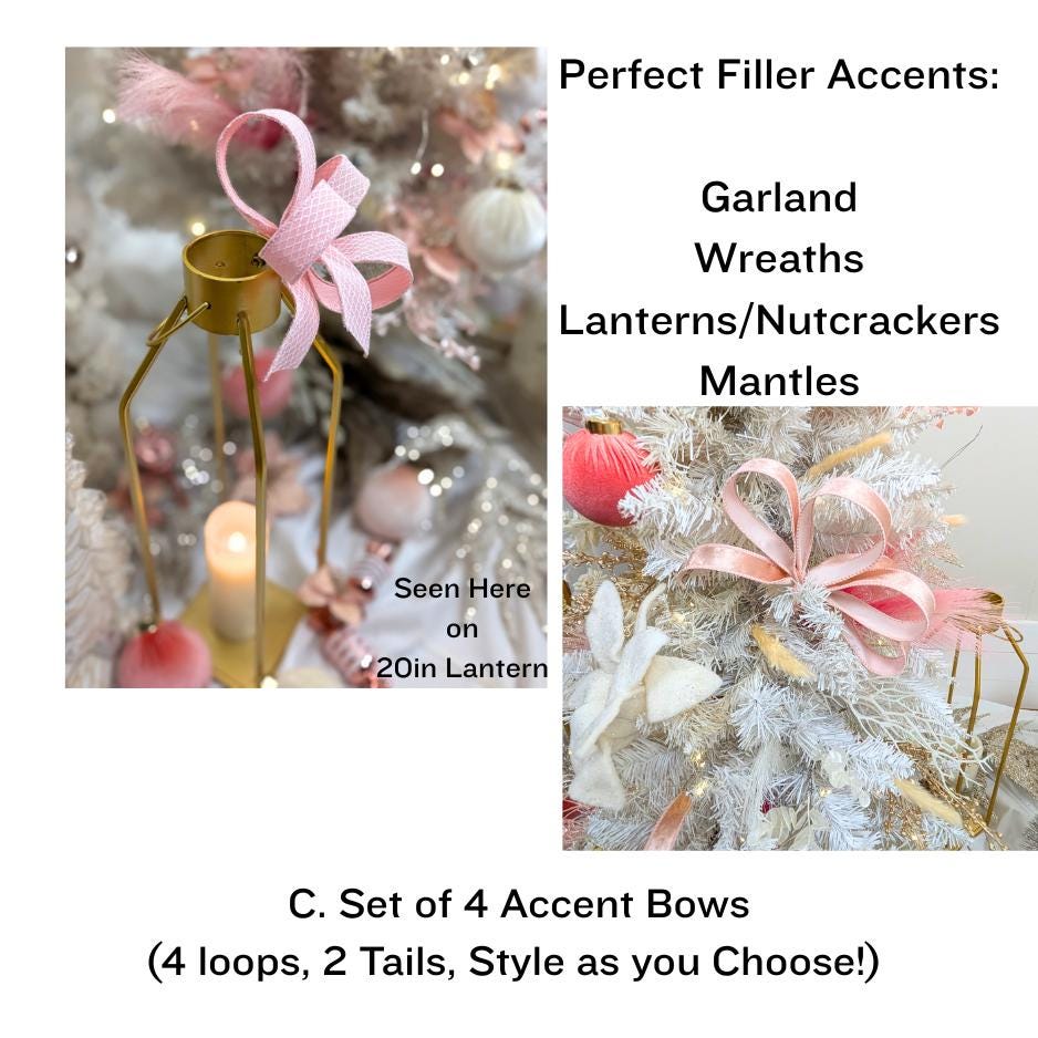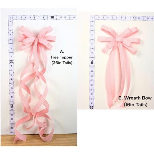 A and B are each 10 inches wide, featuring 5 loops on either side. They arrive fluffed, shaped, and ready to hang. C, the set of accent bows, is shipped ready for you to shape and fluff, allowing you to customize them to your preference! These bows are designed to provide filler and add dimension, so be sure to secure them in place before adjusting the loops to match your decorating style! Additionally, there’s a QR code on your box that links to a quick video with styling and decorating tips!