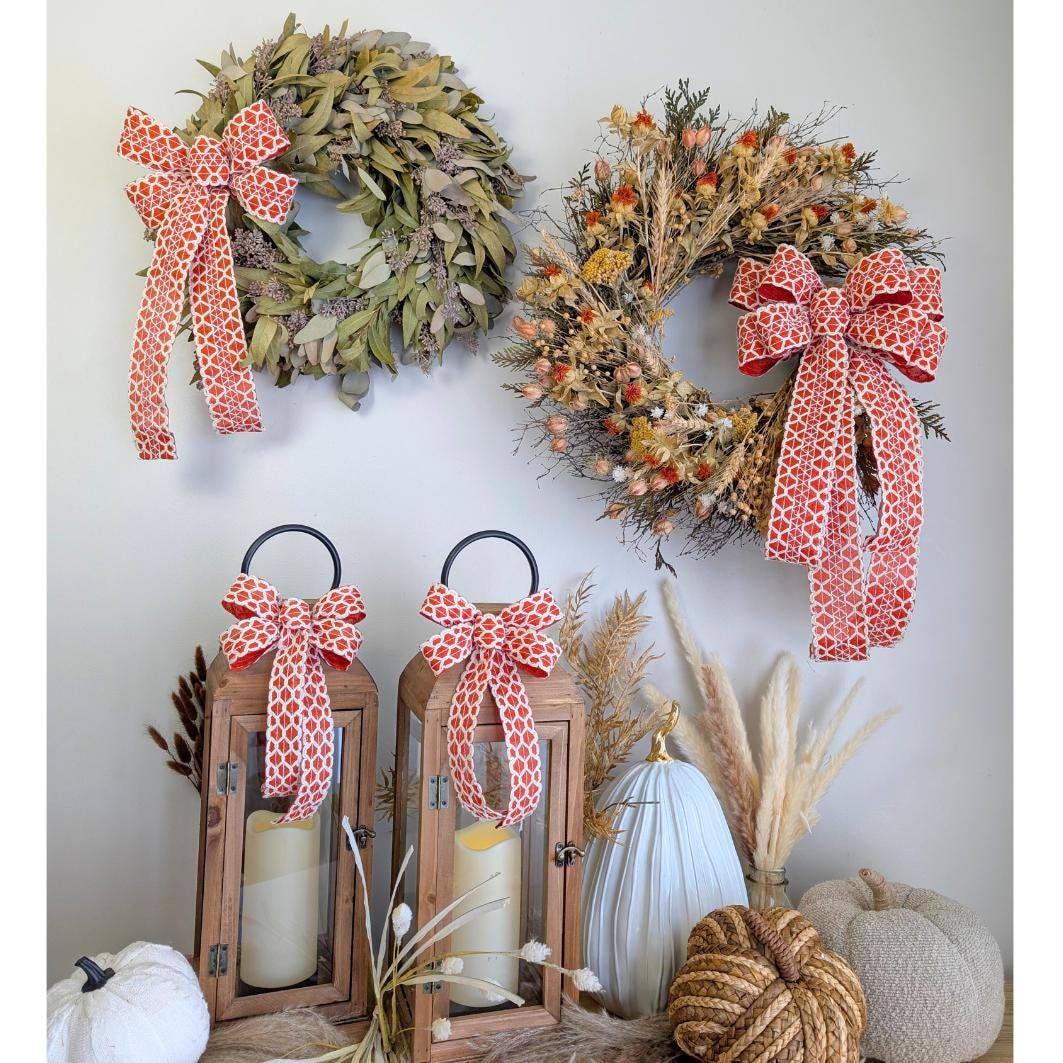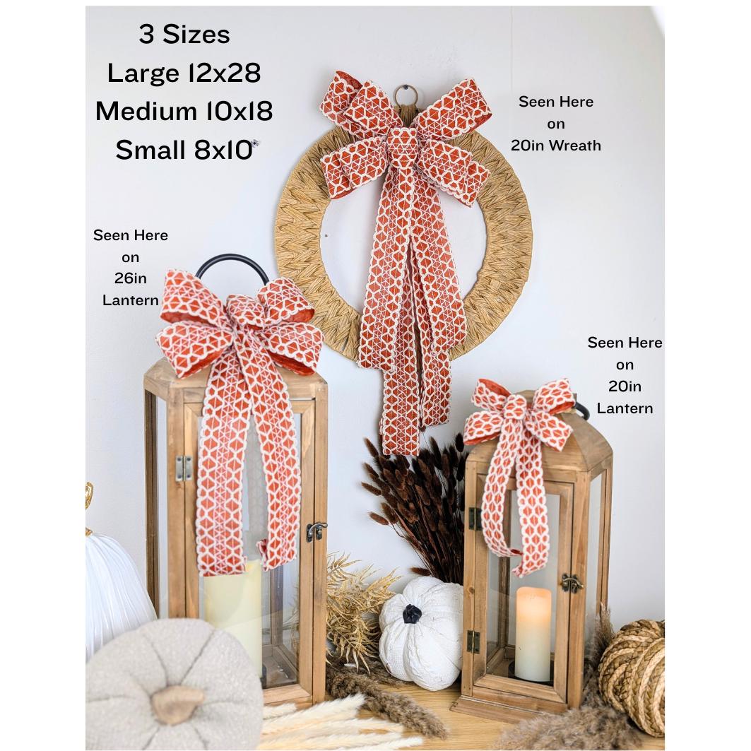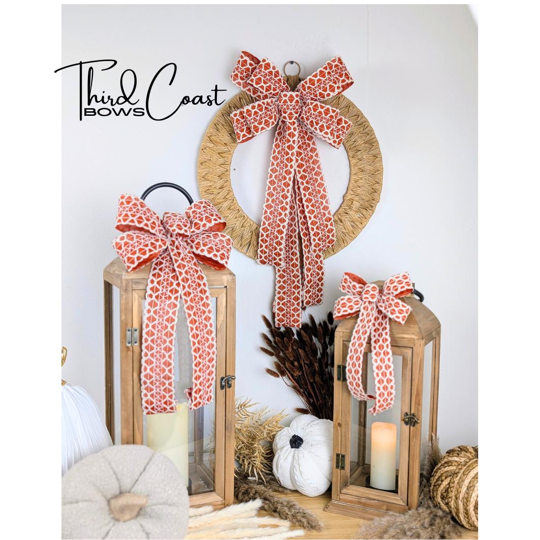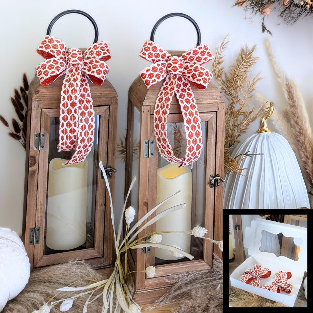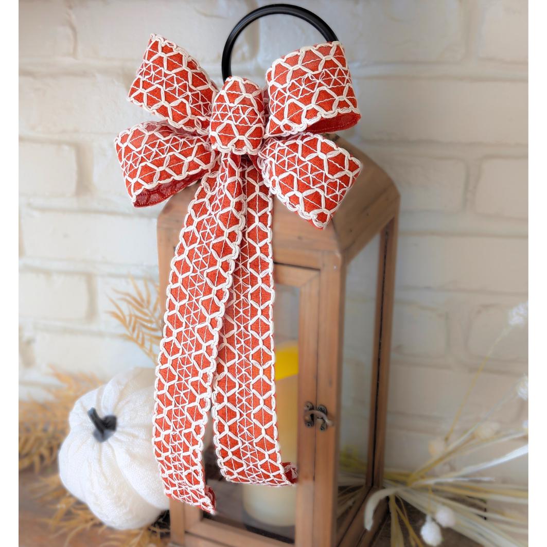 This stunning ribbon is more than just a print. It features a lovely linen texture in a Burnt Orange/Dark Orange Pumpkin base, complemented by a delicate white cotton lace-like overlay, creating a soft and elegant appearance. Your bow will arrive fluffed and ready for use. It includes a chenille stem for easy attachment to your gift or can be used as a bow for lanterns, wreaths, small tree toppers, mantles, garlands, or railings. Each bow is thoughtfully packaged in a storage box.