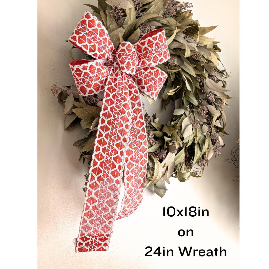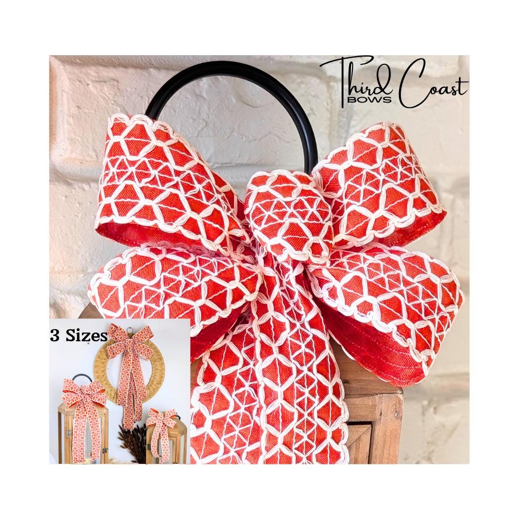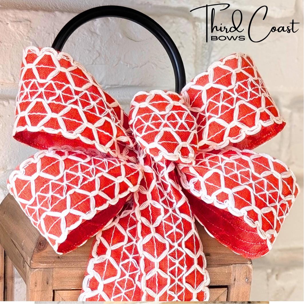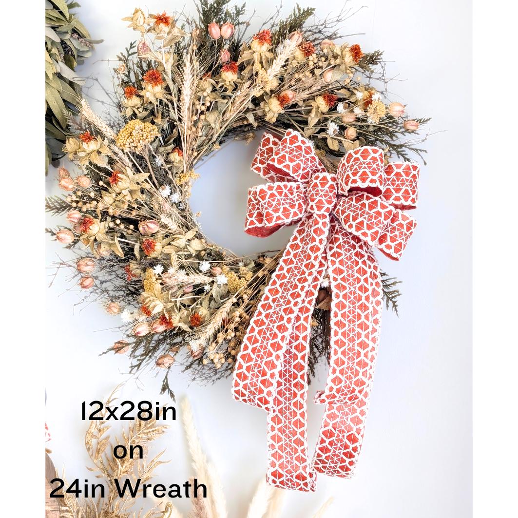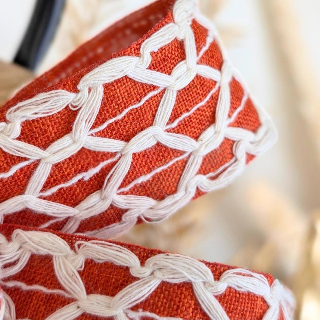 This stunning ribbon is more than just a print. It features a lovely linen texture in a Burnt Orange/Dark Orange Pumpkin base, complemented by a delicate white cotton lace-like overlay, creating a soft and elegant appearance. Your bow will arrive fluffed and ready for use. It includes a chenille stem for easy attachment to your gift or can be used as a bow for lanterns, wreaths, small tree toppers, mantles, garlands, or railings. Each bow is thoughtfully packaged in a storage box.