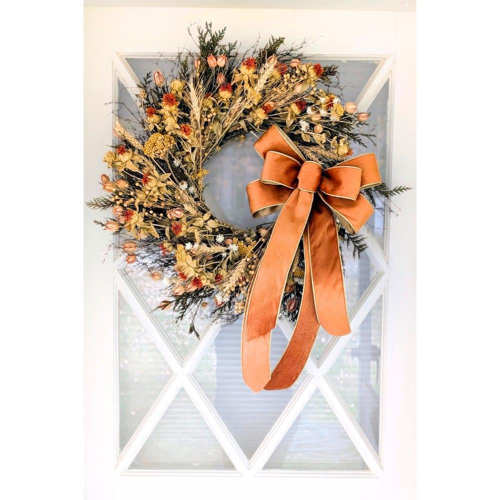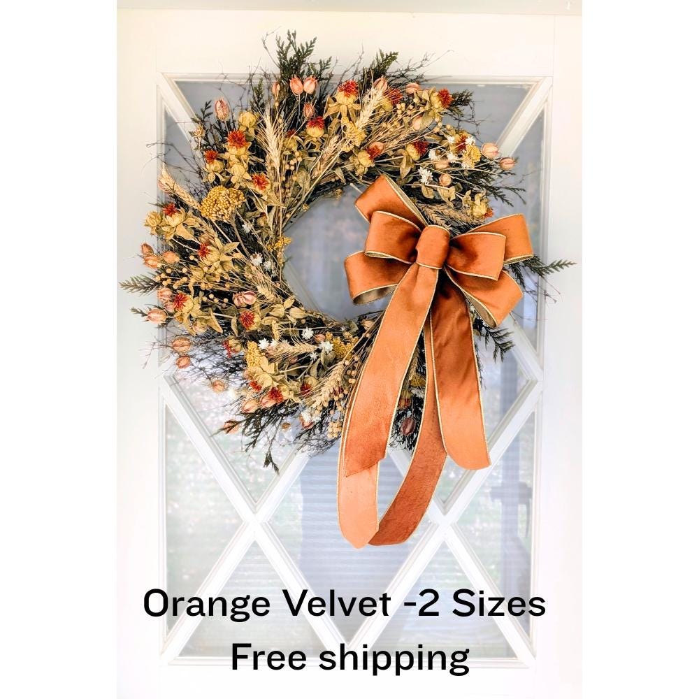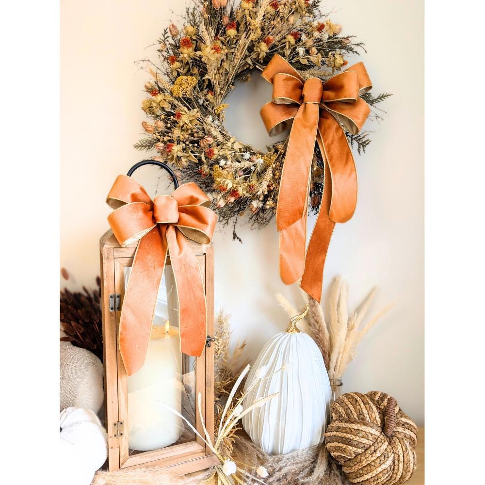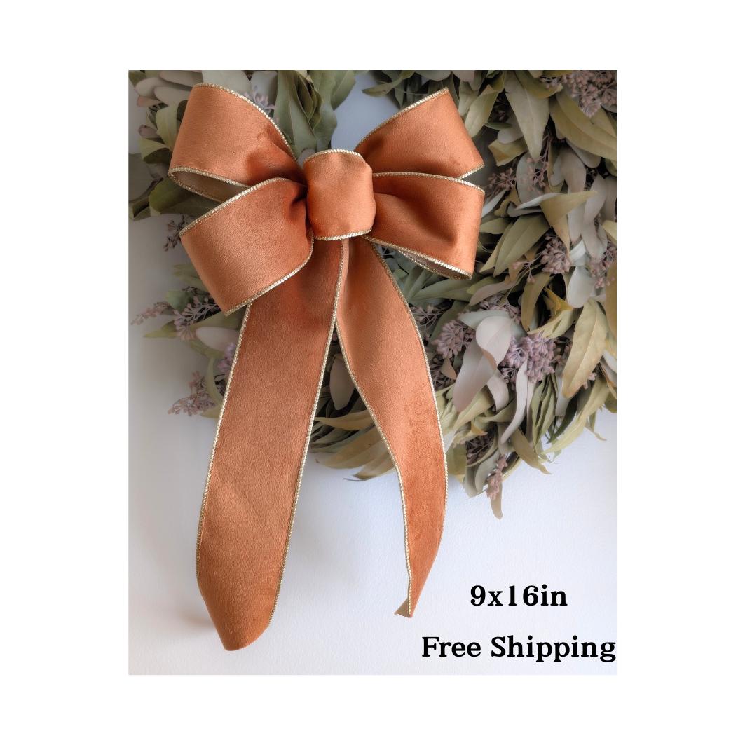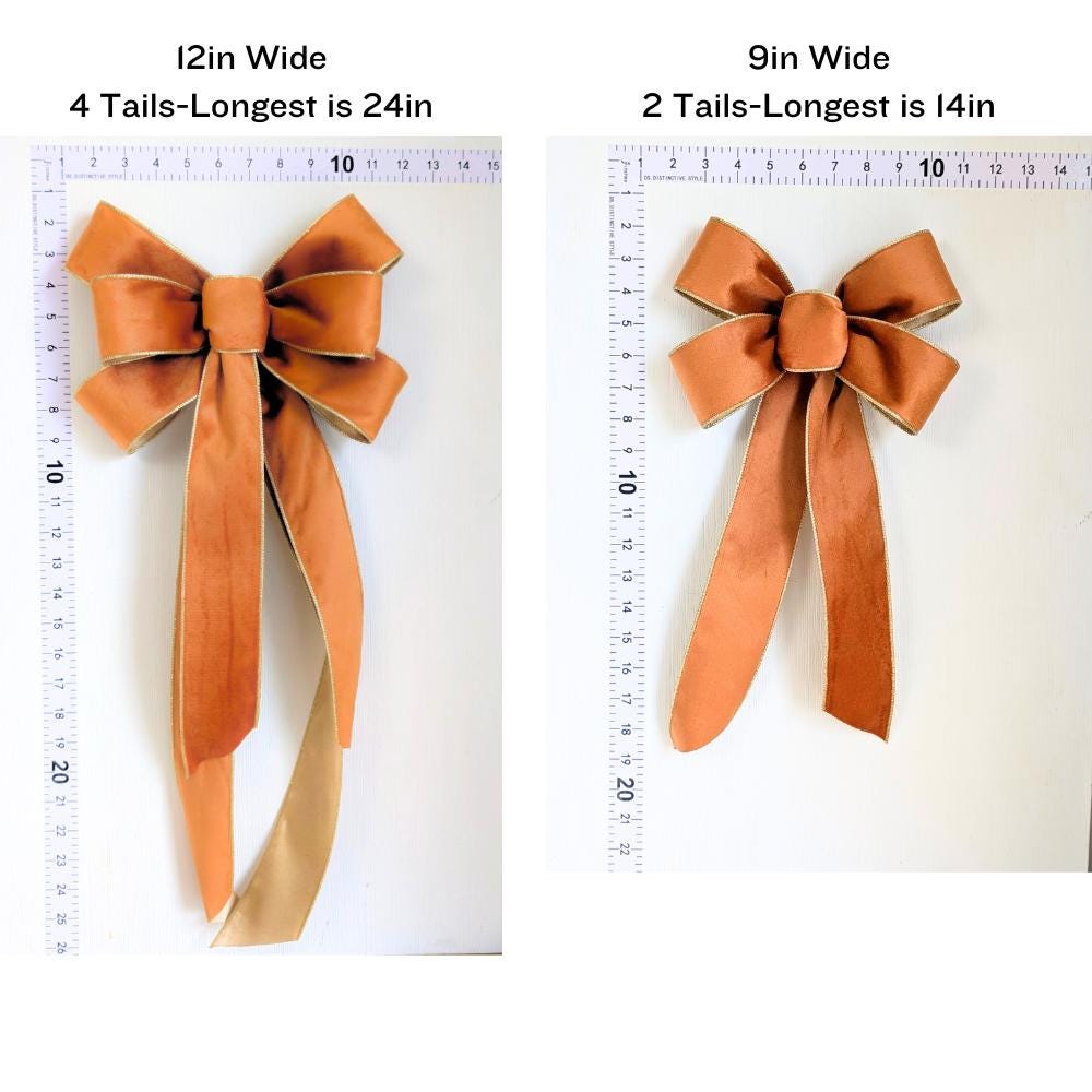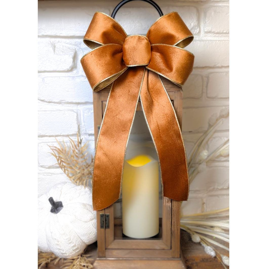 This beautiful Luxe soft Orange/Copper deLUXe matte velvet has a gold lining and thick supporting wires that give it body and hold the shape. Your bow will arrive fluffed and ready for use. It includes a chenille stem for easy attachment to your gift or can be used as a bow for lanterns, wreaths, small tree toppers, mantles, garlands, or railings. Each bow is thoughtfully packaged in a storage box.