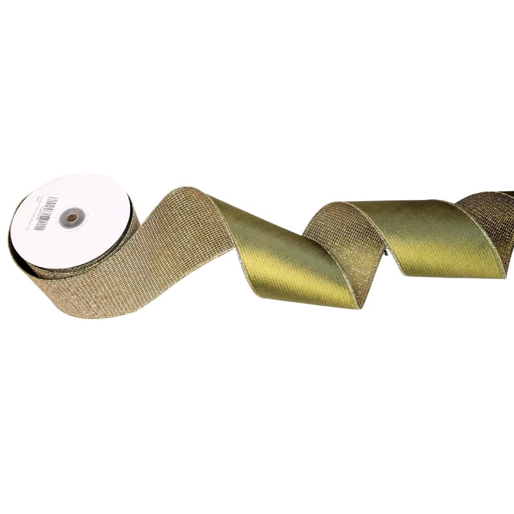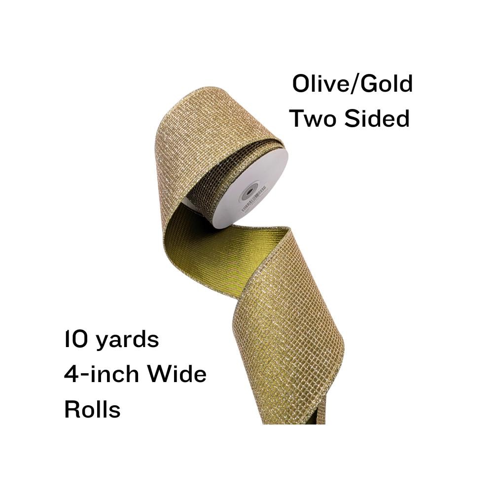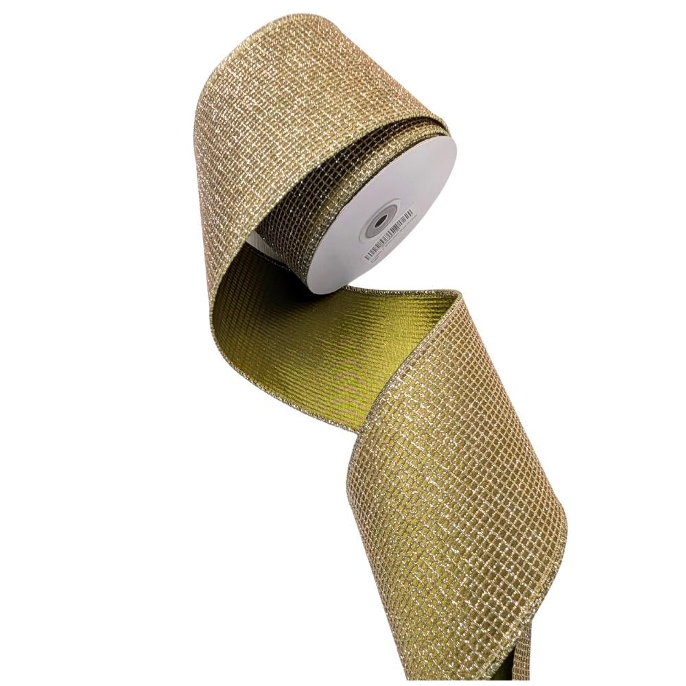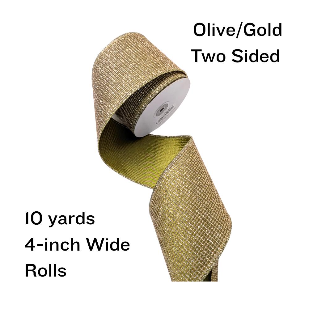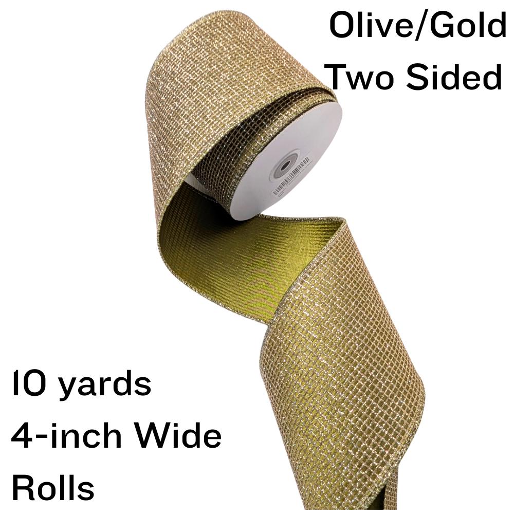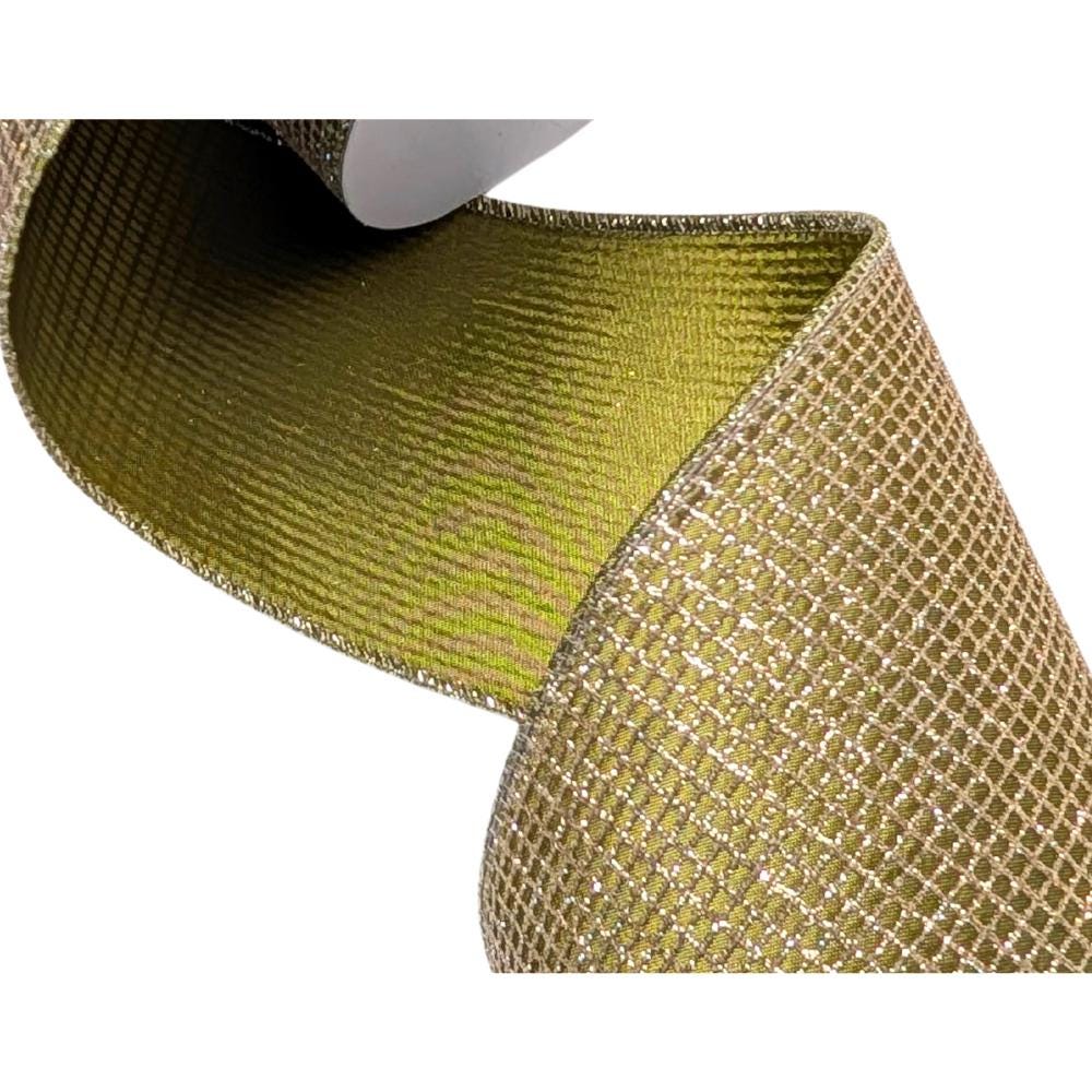 This beautiful two-sided Green and Gold wired ribbon features a stiff body and thick wires on the sides for added volume and body, perfect for all your holiday decor ideas. Sold in FULL 10 yard rolls. The Gold glitter side features a geometric grid over moss and olive, while the other side boasts a low-luster, gorgeous green that can be the feature color as well.