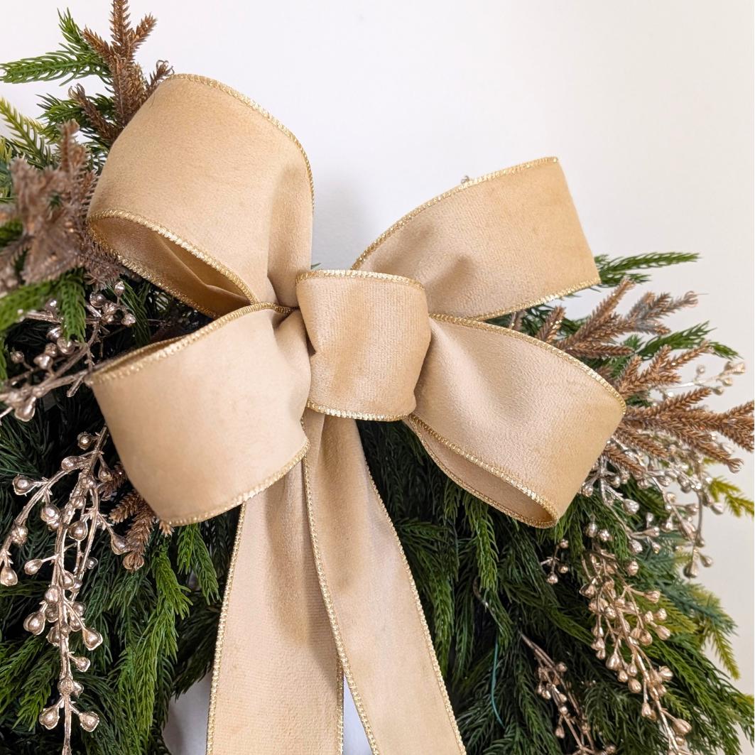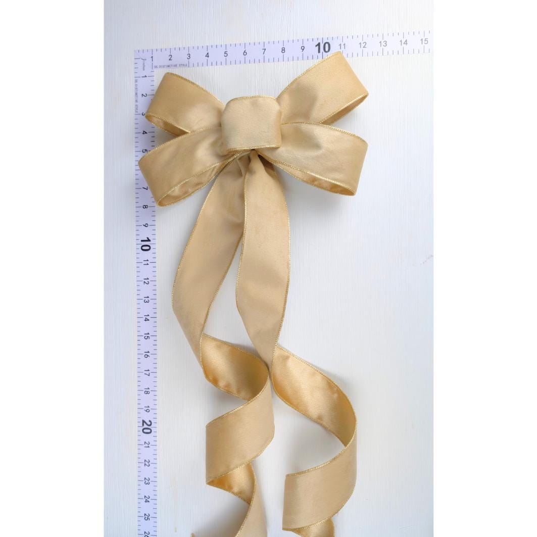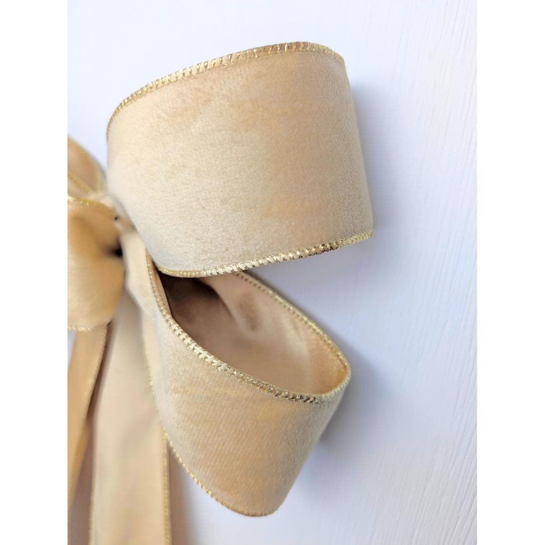 This stunning 2.5-inch wide tan sueded-velvet bow, featuring a gold wire edge and satin lining, is the perfect enhancement for a warm, neutral palette and beautifully complements a variety of styles. The timeless fabric includes a sturdy wire, ensuring it holds its shape when styled.