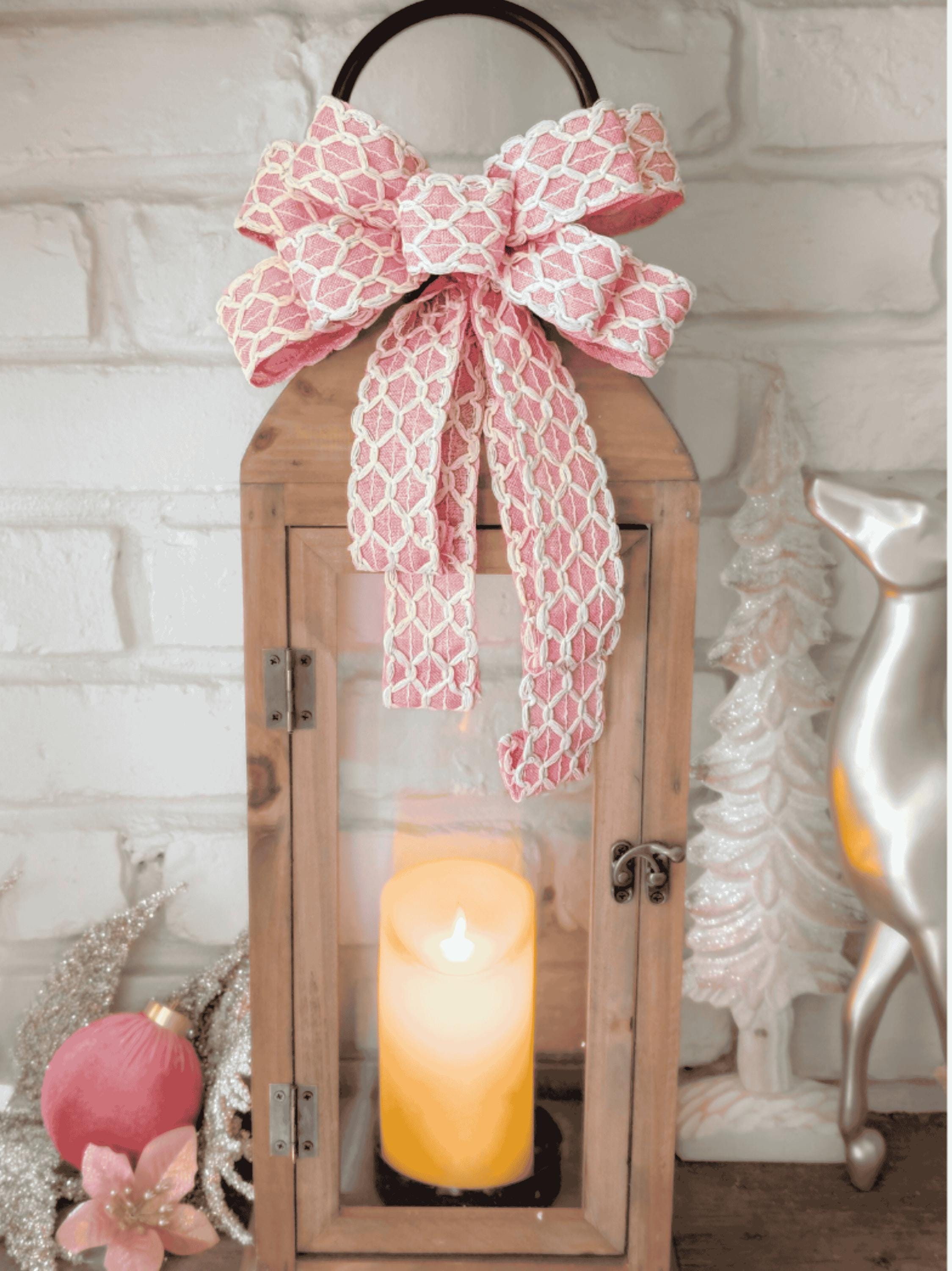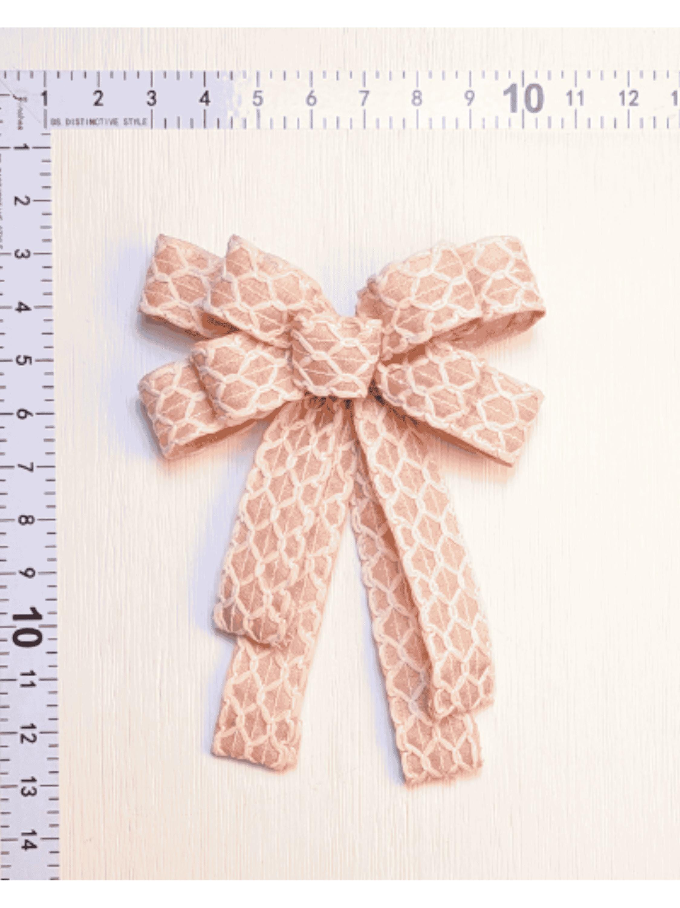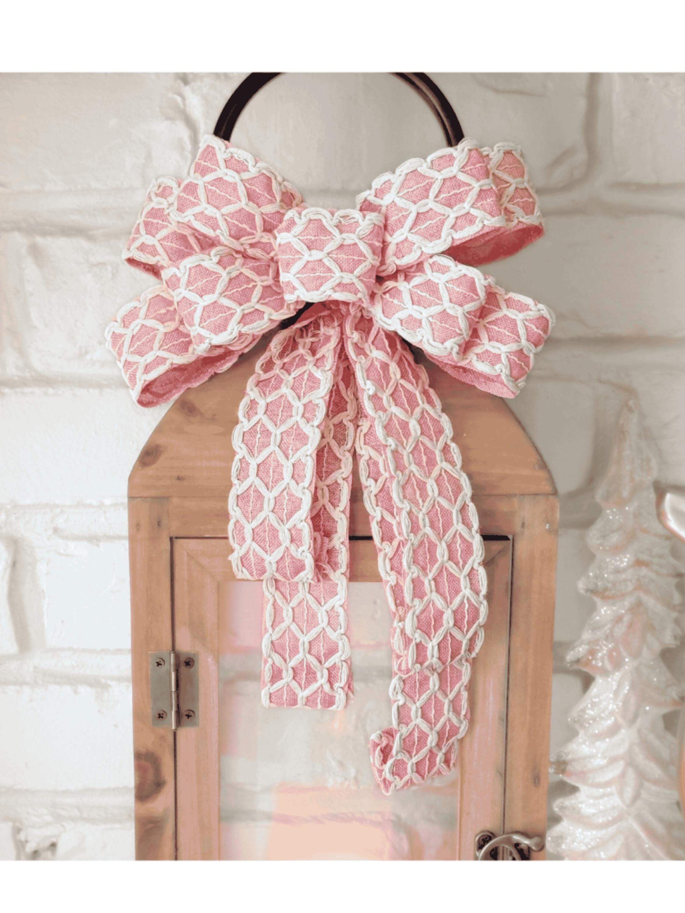 Pretty in Pink this Easter Bow is lightly wired 1.5in wide ribbon with a beautiful lattice overlay in cream. The tails are folded, and the ribbon is a medium-weight, lightly wired cotton that will drape beautifully.