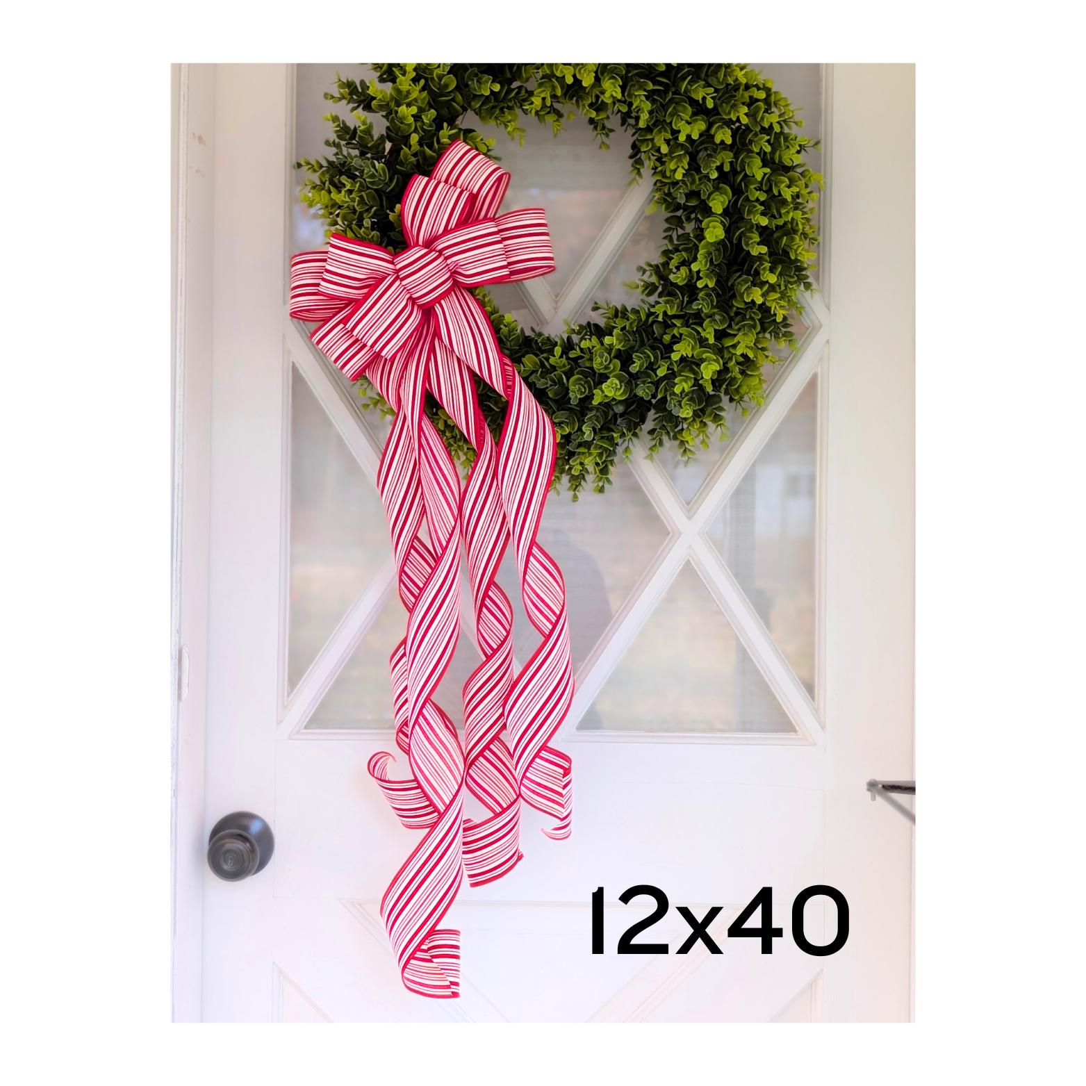 This XL bow is soft and bouncy and works great on any wreath 24in and larger. Check out my shop for smaller sizes and options. The 36in also works beautifully as a tree topper for trees 6ft and up. There are 4 tails in total. These fabulous ticking stripes in Bright Red and White are a polyblend, a light-medium weight ribbon that arrives in a storage box, fluffed, and ready to enjoy! Shipping is included. The ribbon is not rated for outdoor use; it's ideal for indoors and covered areas.