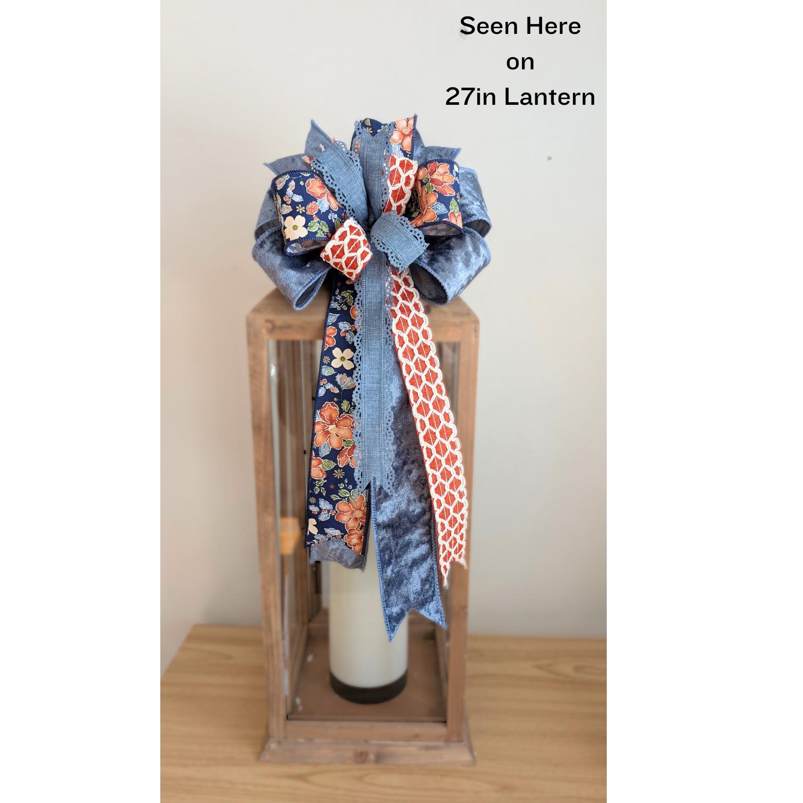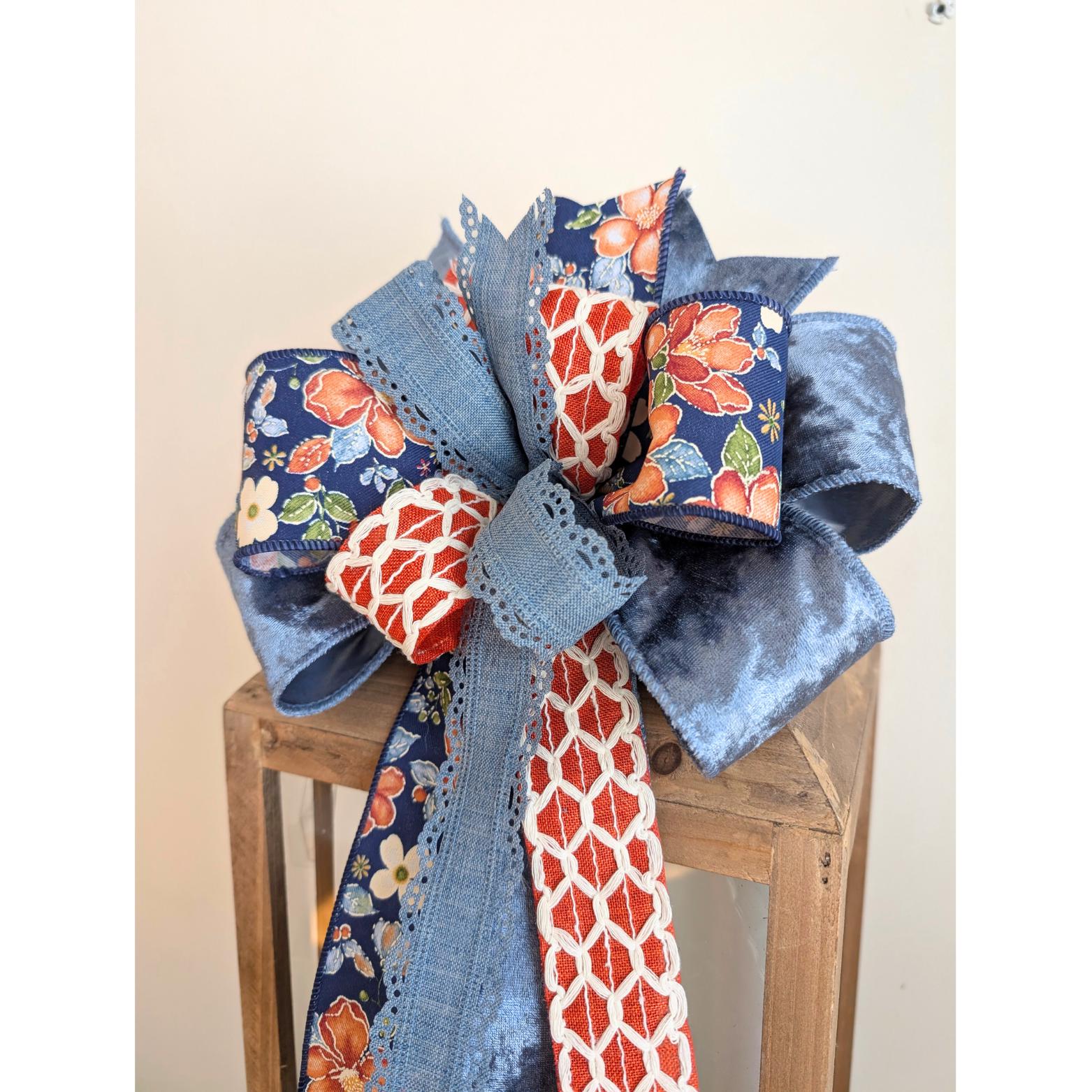 Description: This bow is made from 4 ribbons: a mix of 1.5 and 2.5in wide wired ribbons in velvet, denim, a floral print, and a scalloped lace/denim print. It's secured with a zip-tie, attaches with a pipe cleaner, and comes in its own box for easy seasonal storage. The ribbons are not rated for outdoor/exposed use and are best when used indoors or in a covered/protected area. They will hold up to light outdoor use.