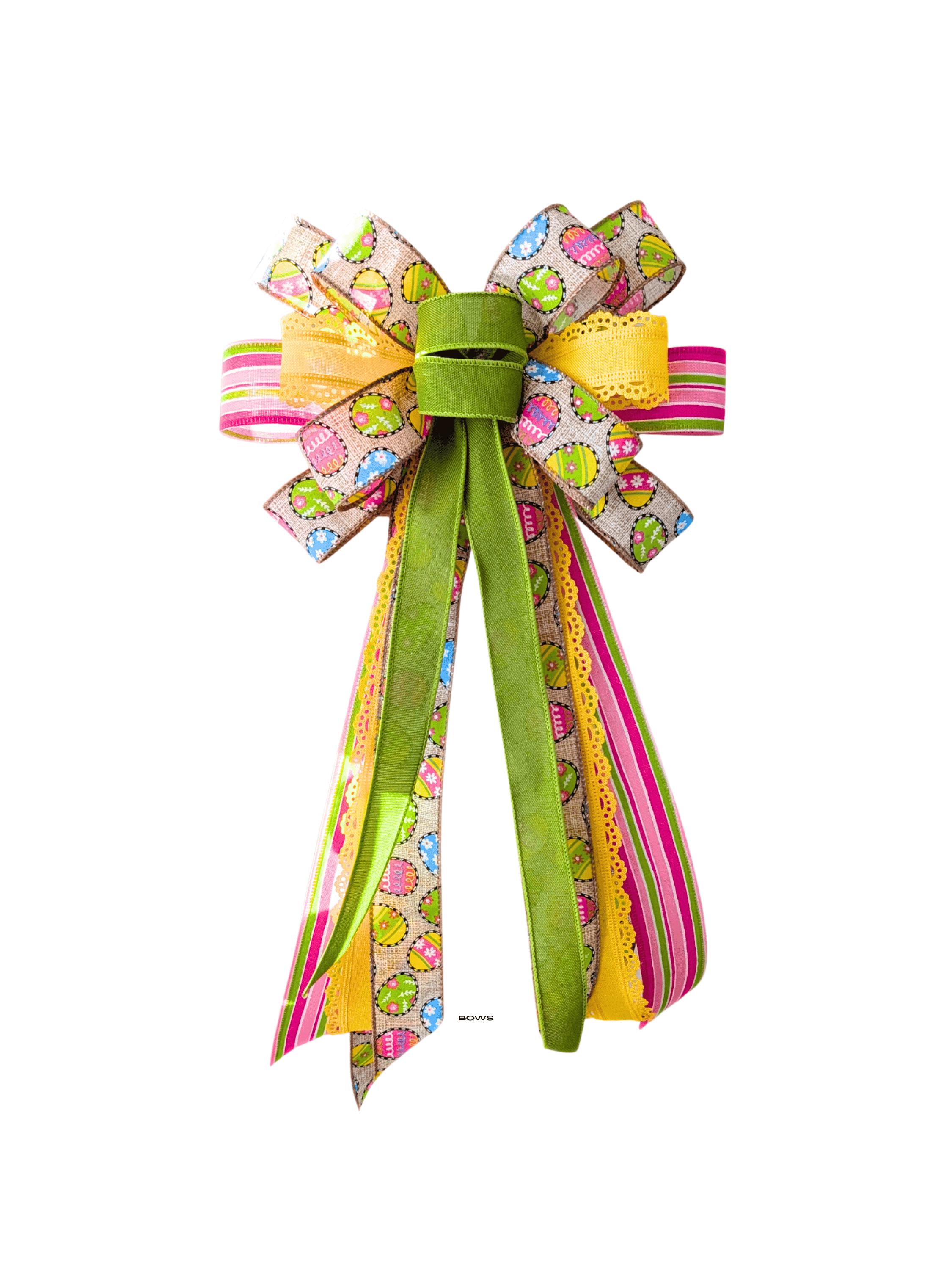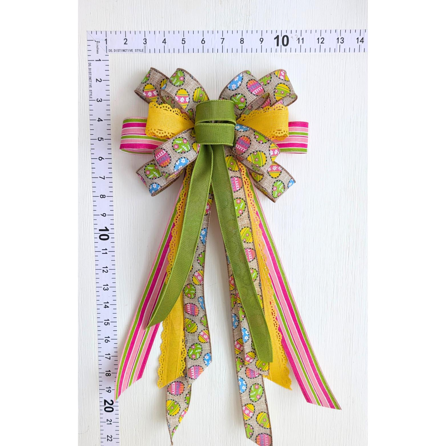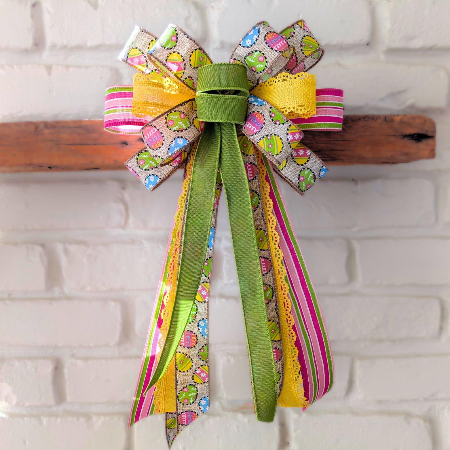 Pretty in Pinks and Greens with a delightful Easter Egg print ribbon wreath bow. Fun for front door decorations, wreaths, lanterns, baskets, large gifts, and medium displays/tablescapes.