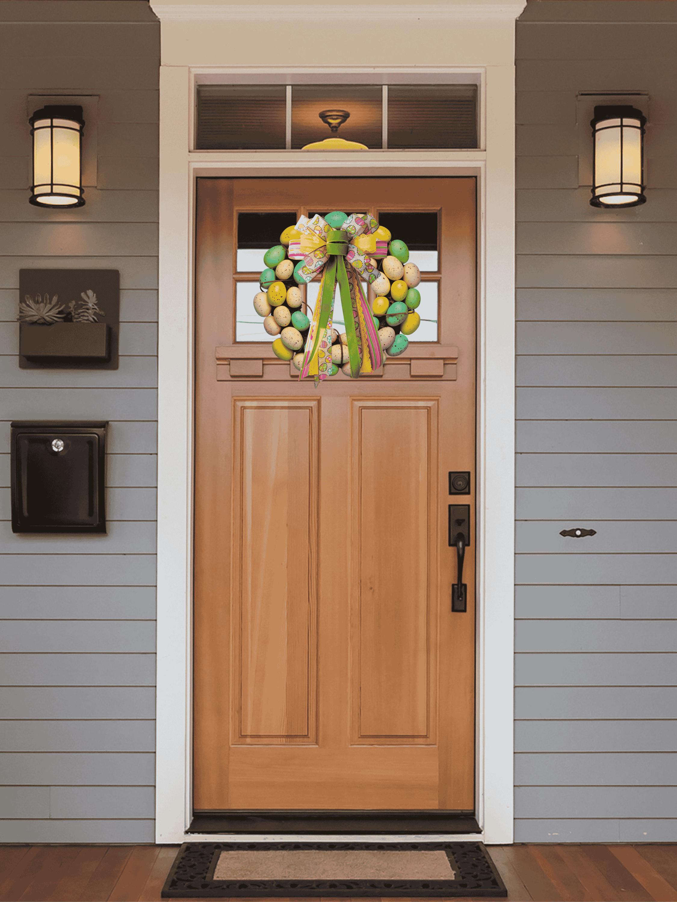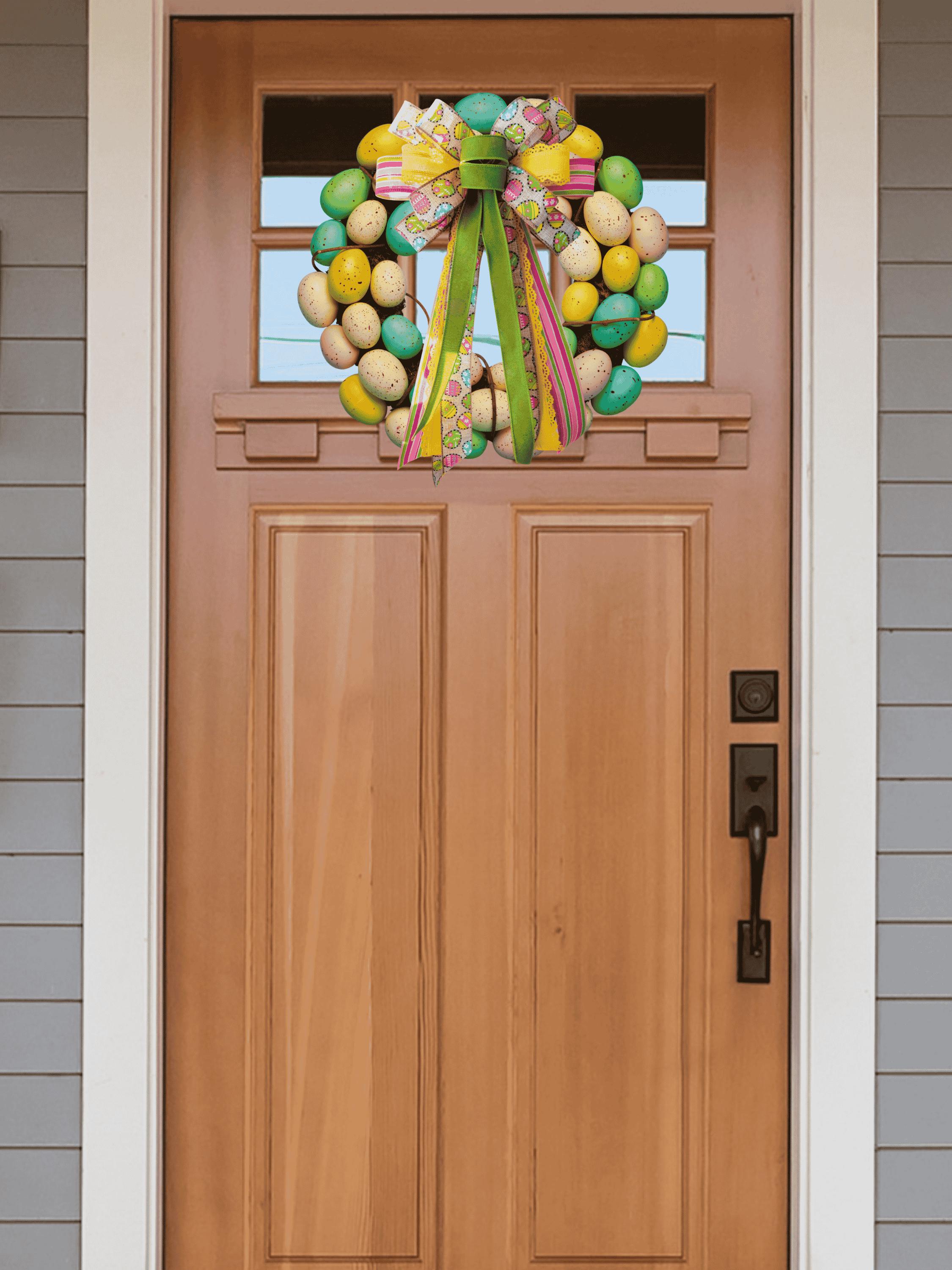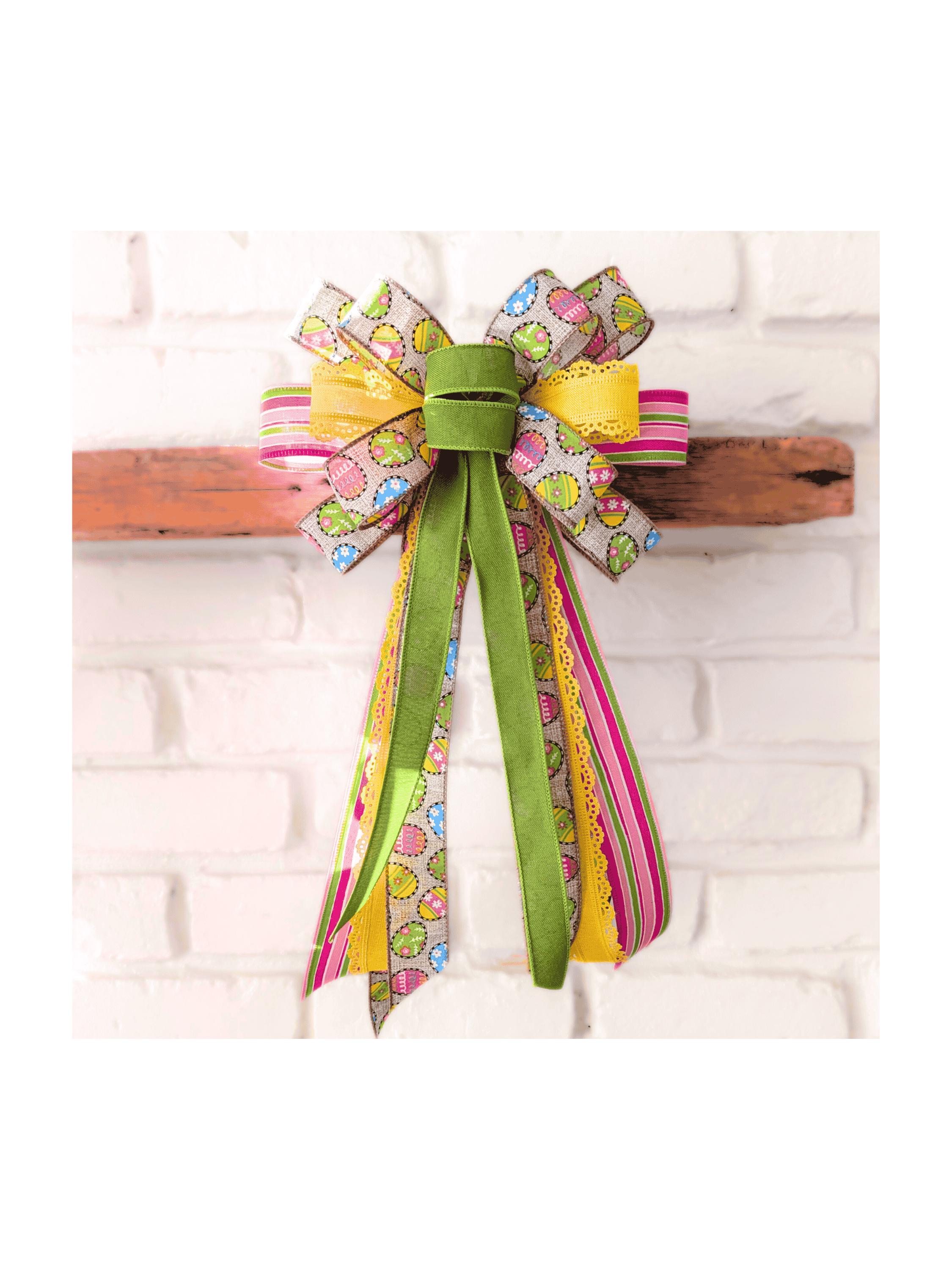 Pretty in Pinks and Greens with a delightful Easter Egg print ribbon wreath bow. Fun for front door decorations, wreaths, lanterns, baskets, large gifts, and medium displays/tablescapes.