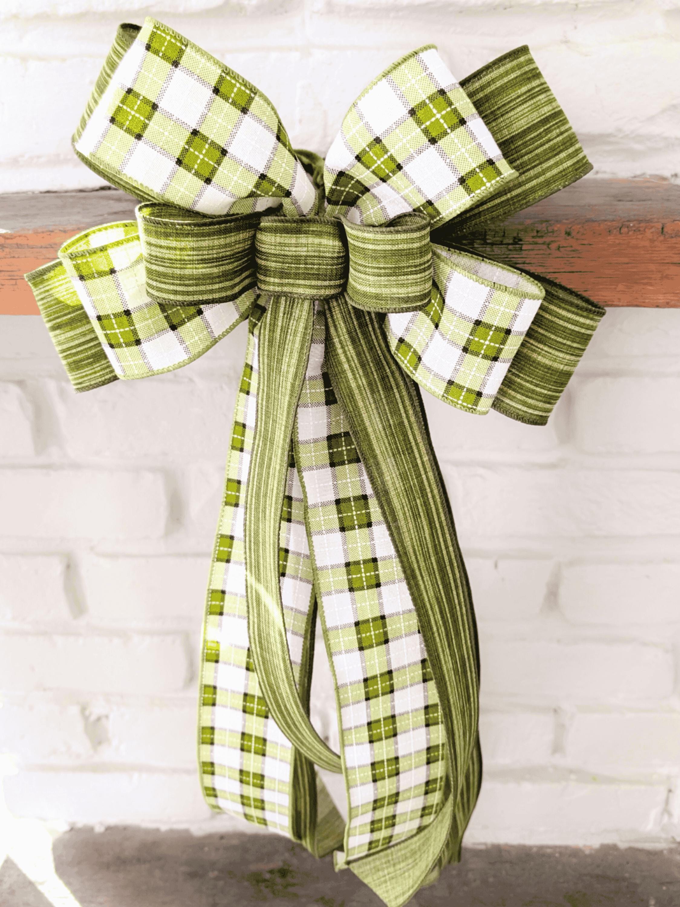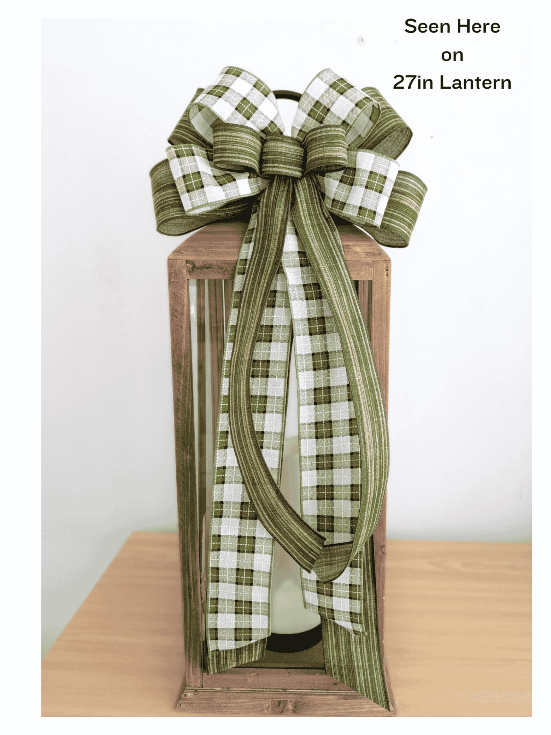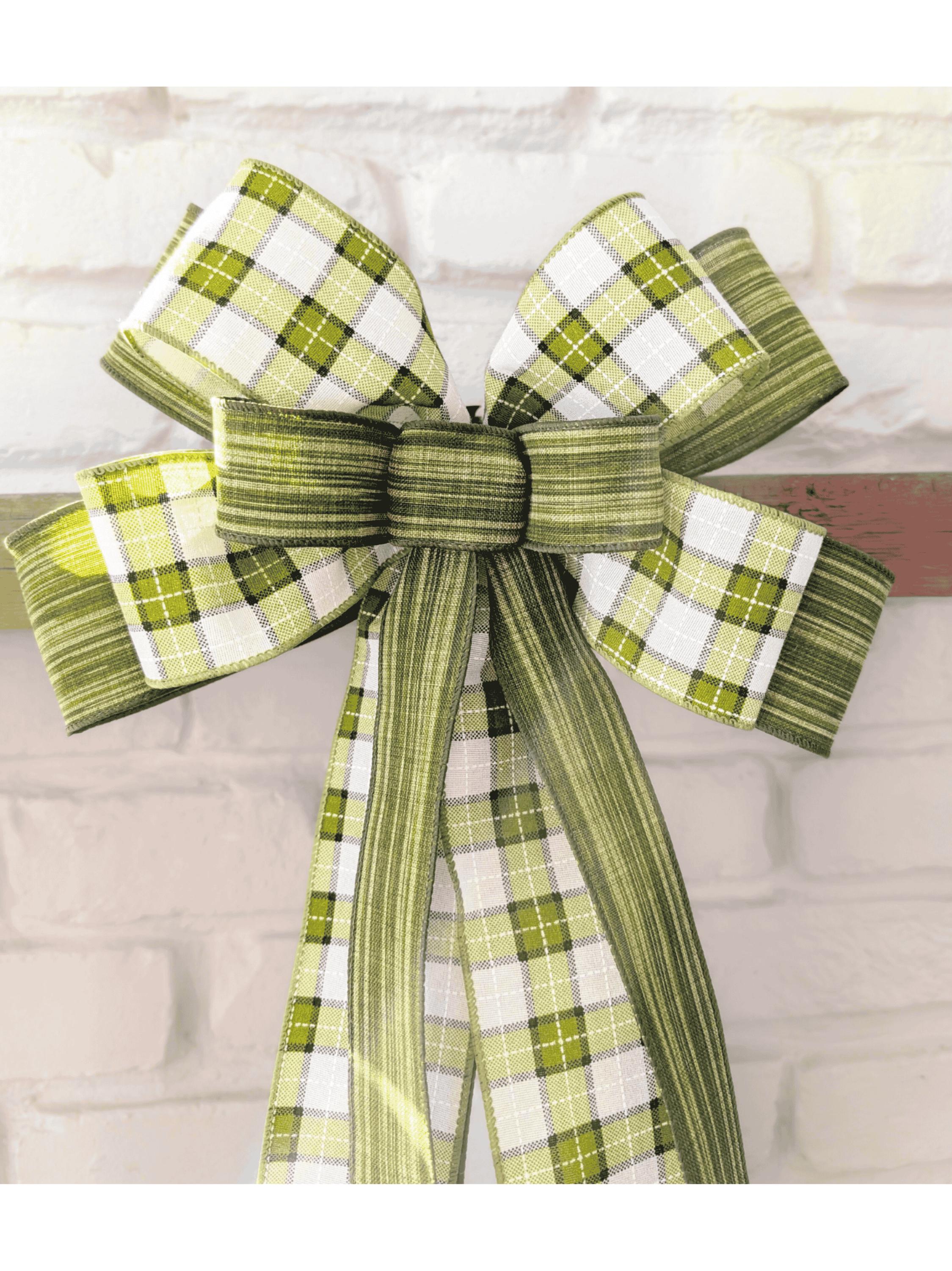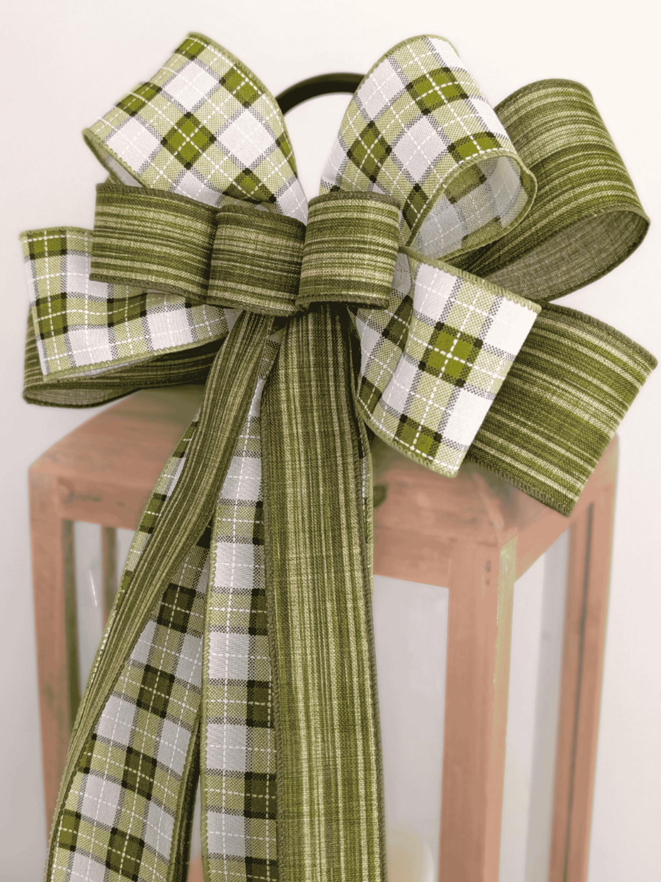 - Made with 3 premium wired ribbons in plaid, olives, and cream