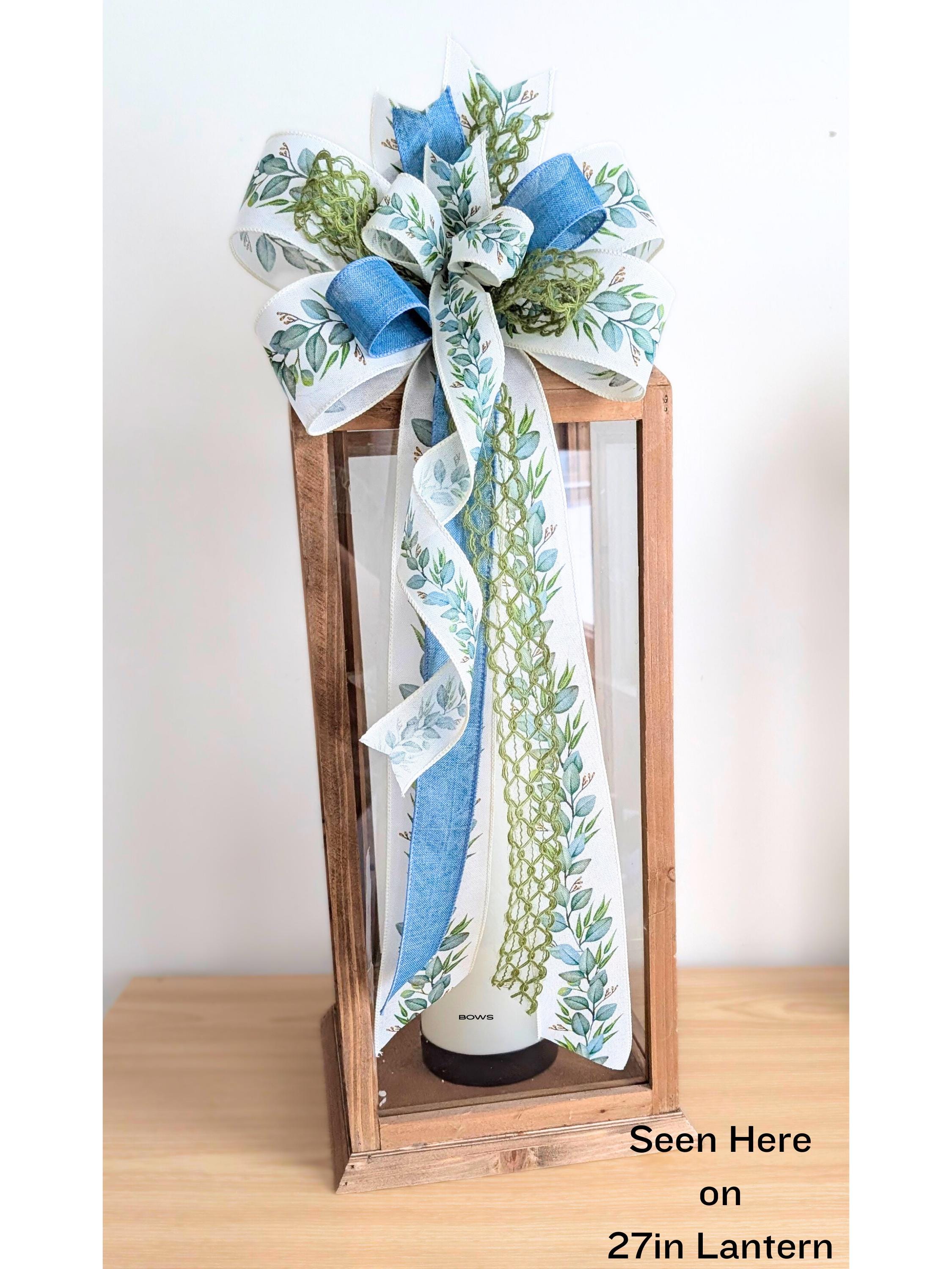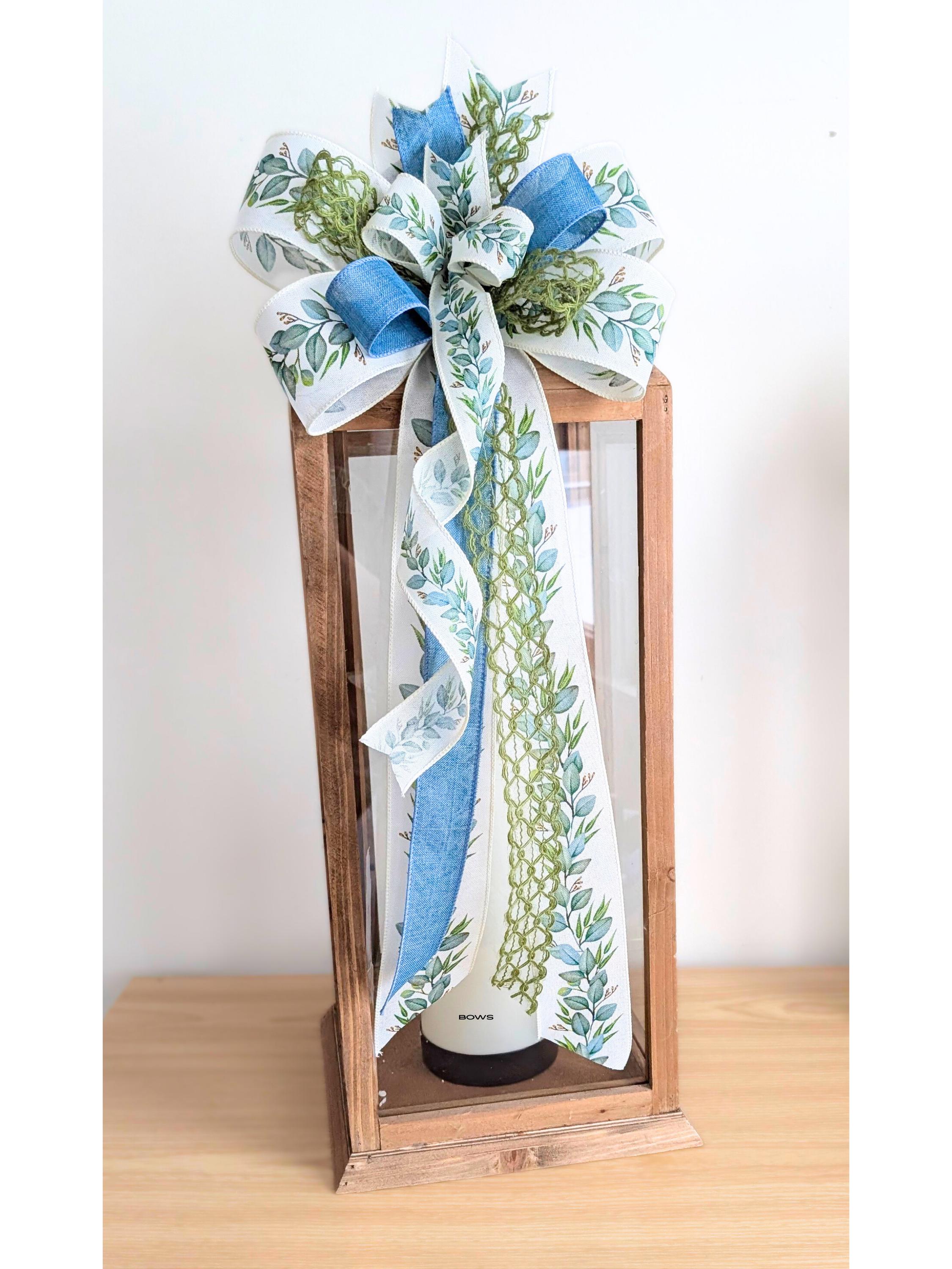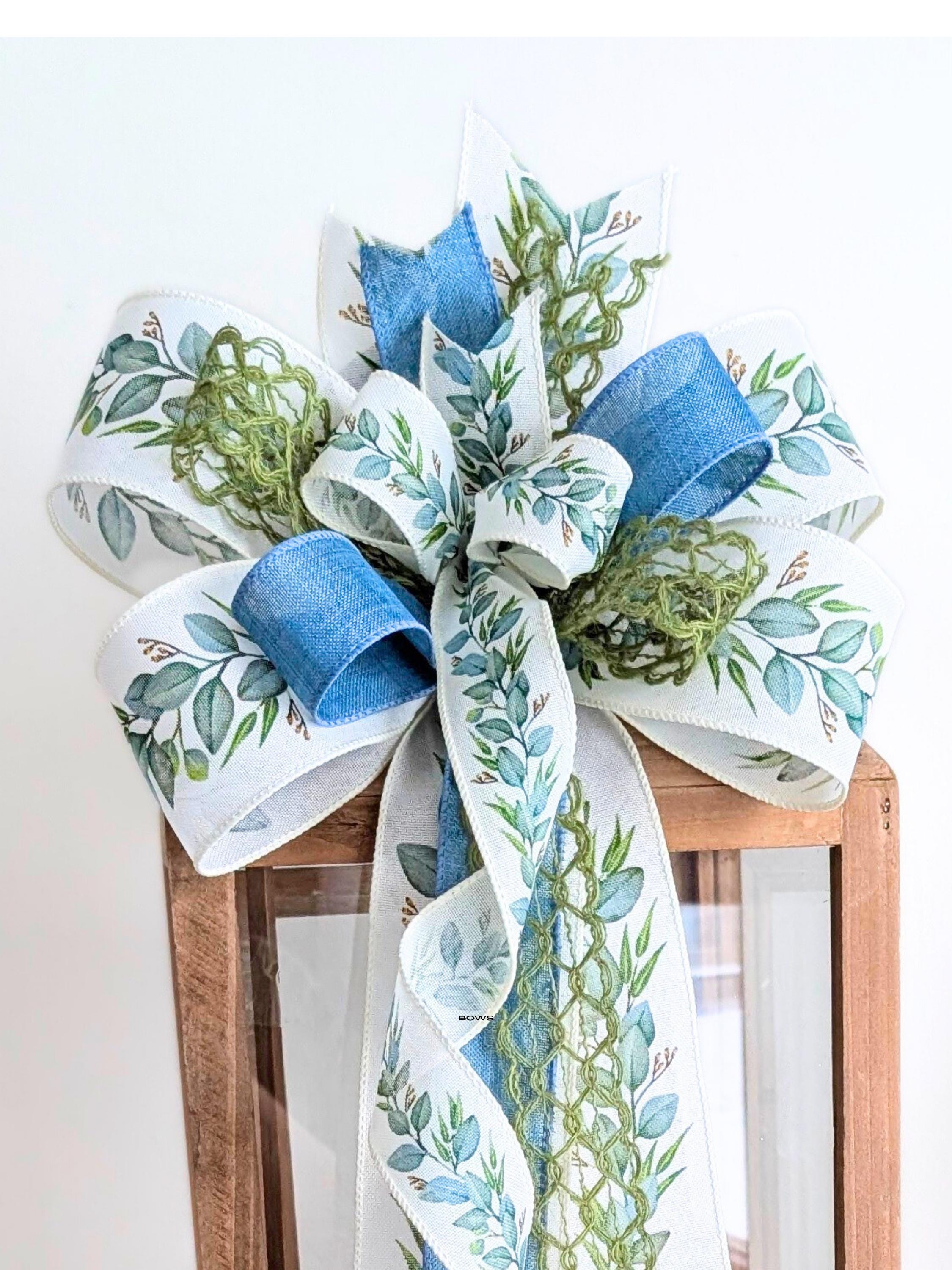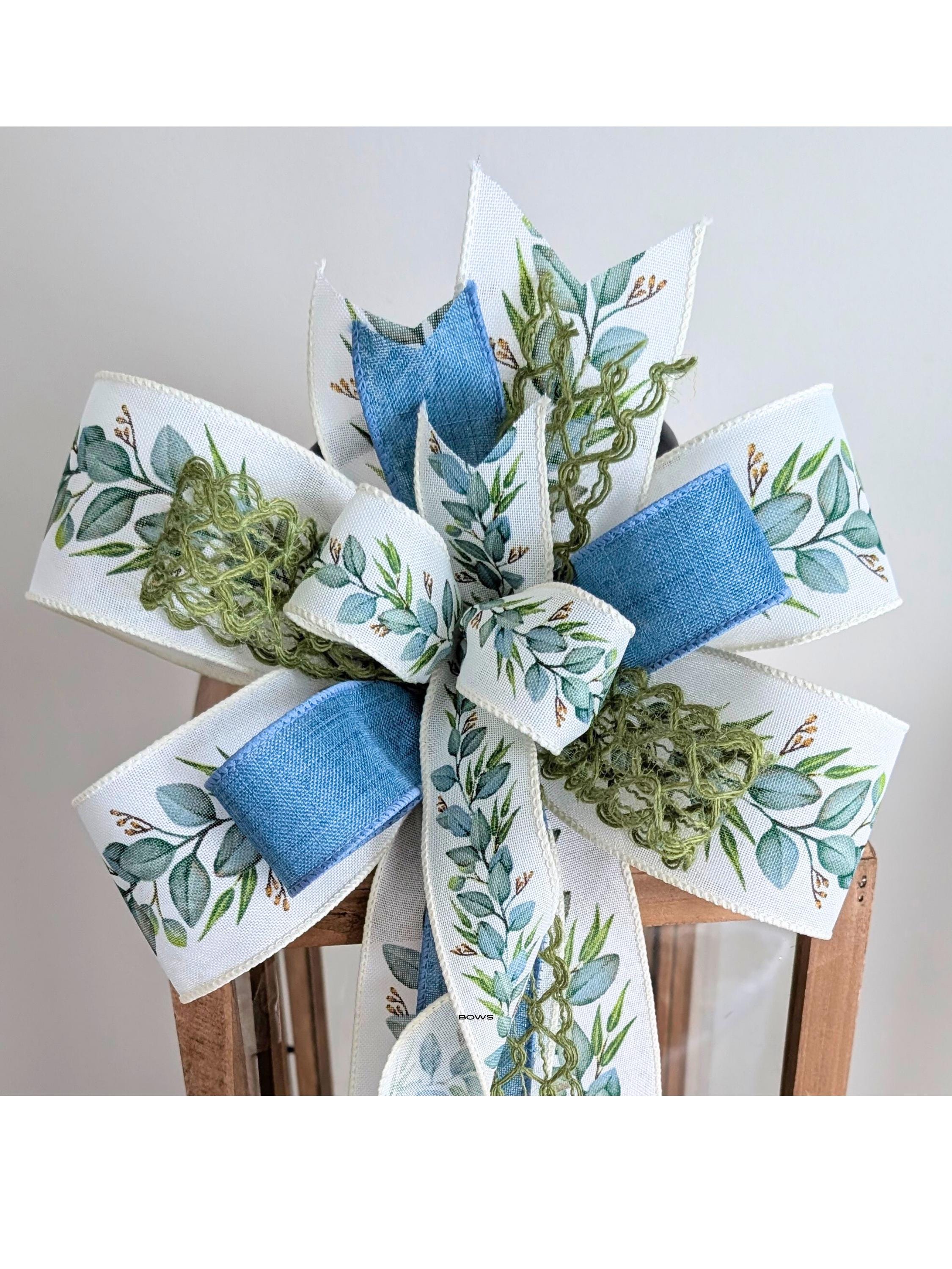 This pretty Blue and Cream Floral Wreath Bow is perfect for Spring and Summer decor. The Eucalyptus print has blues, greens, and some chocolate brown in the linen wired ribbon.