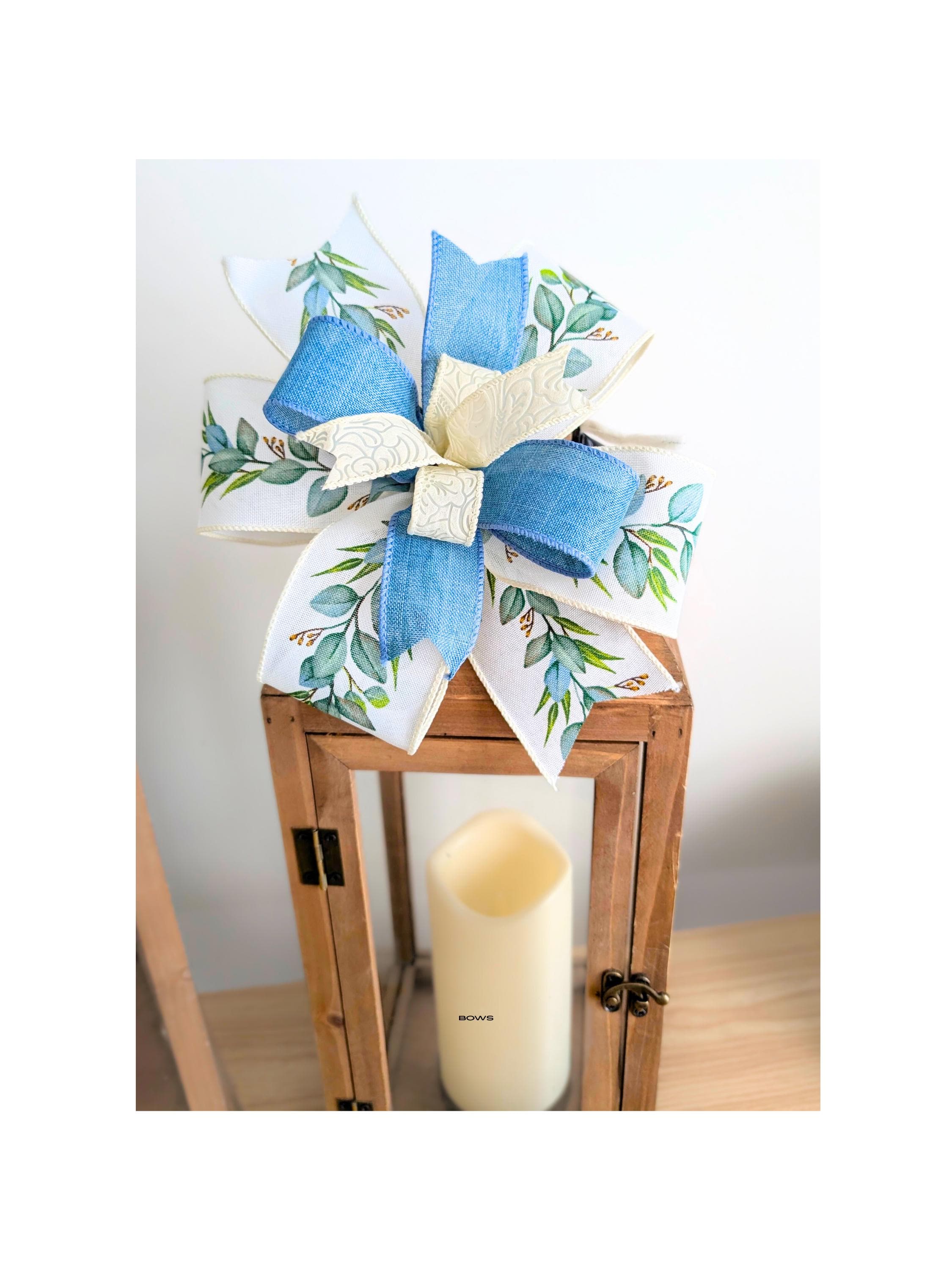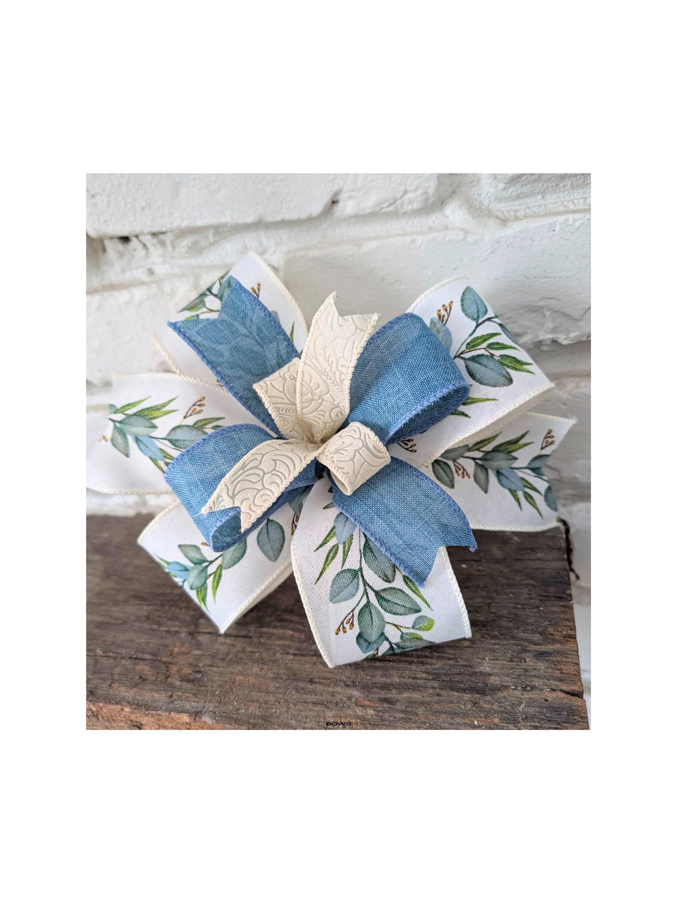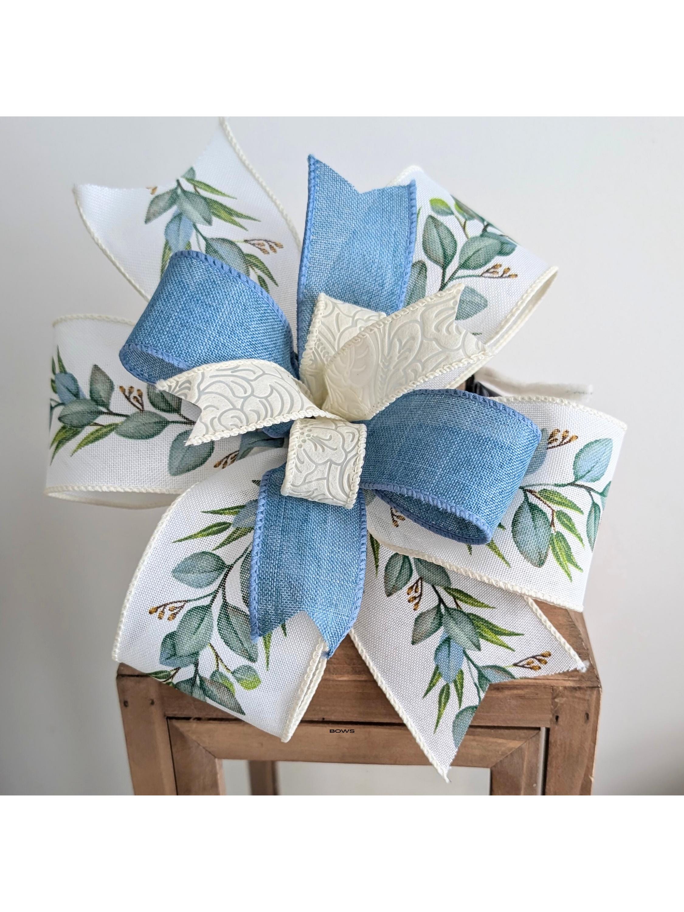 This pretty Blue and Cream Floral Wreath Bow is perfect for Spring and Summer decor. The Eucalyptus print has blues, greens, and some chocolate brown in the linen wired ribbon.