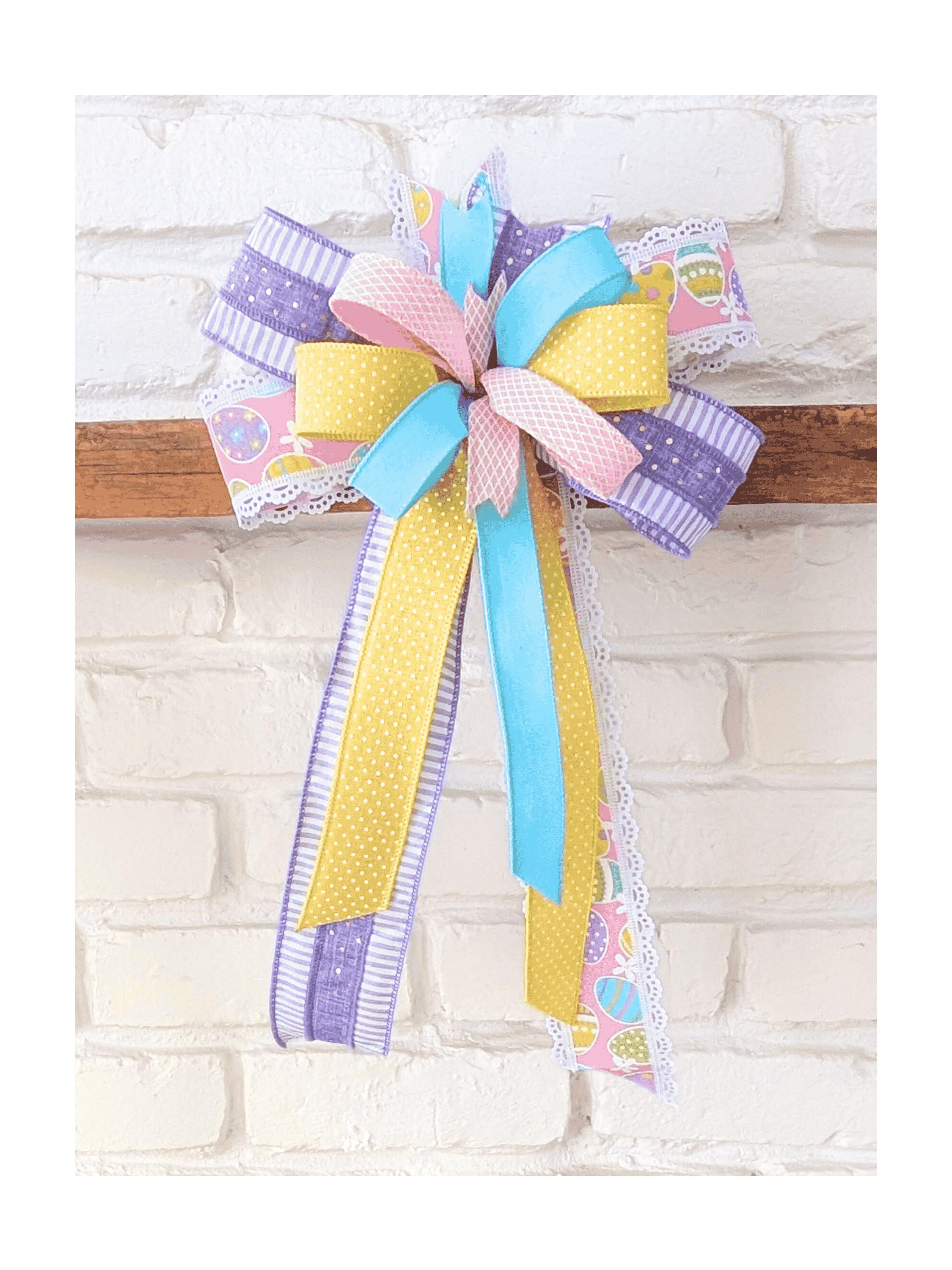 Crafted with 6 different ribbons, this pretty Easter bow is great for many uses! Front door decorations, baskets, tablescapes, Easter party decorations, mantles, wreaths, and lanterns. Make a fun and festive moment with happy colors.