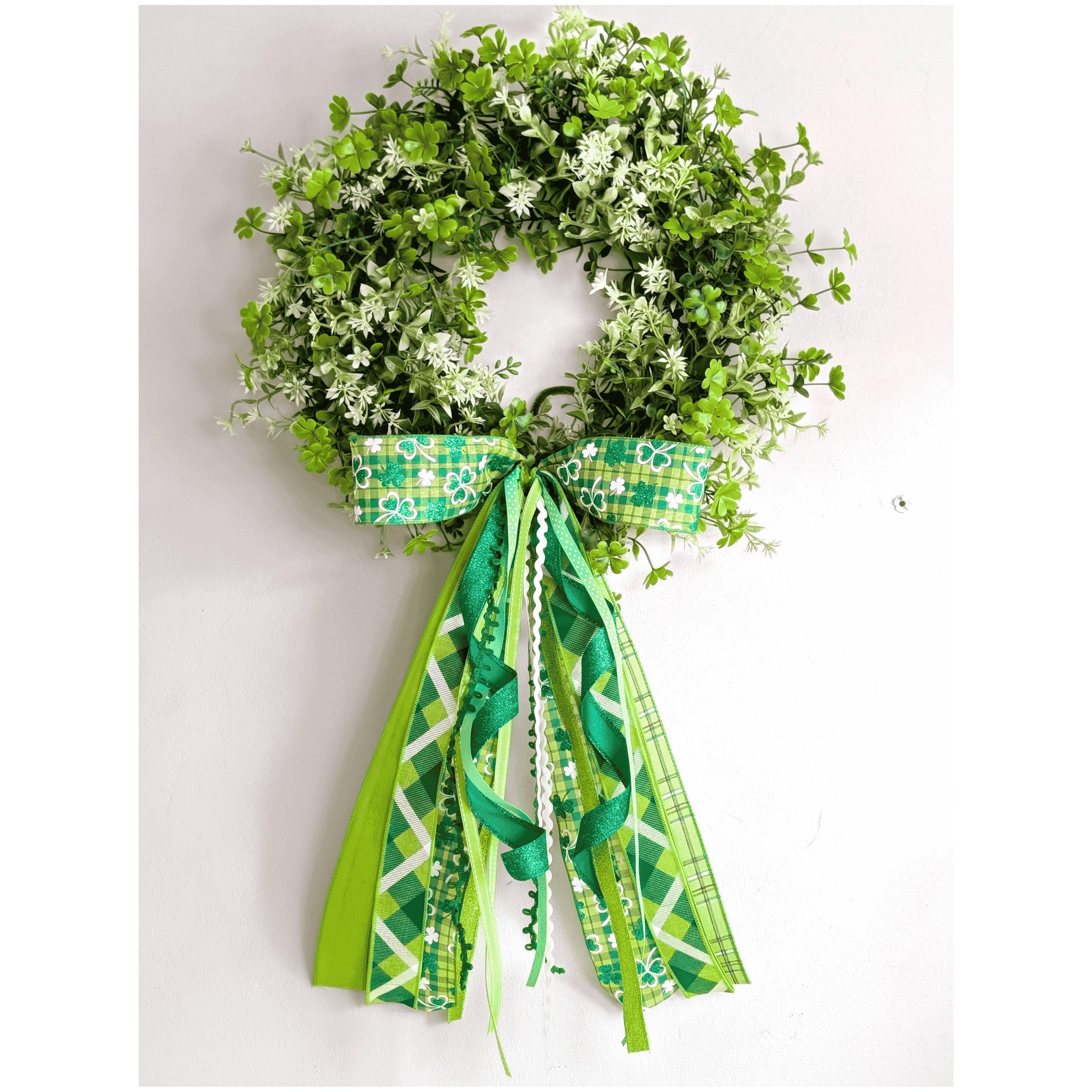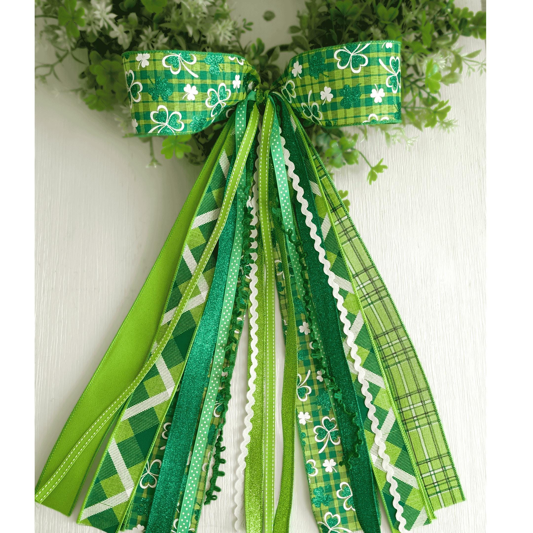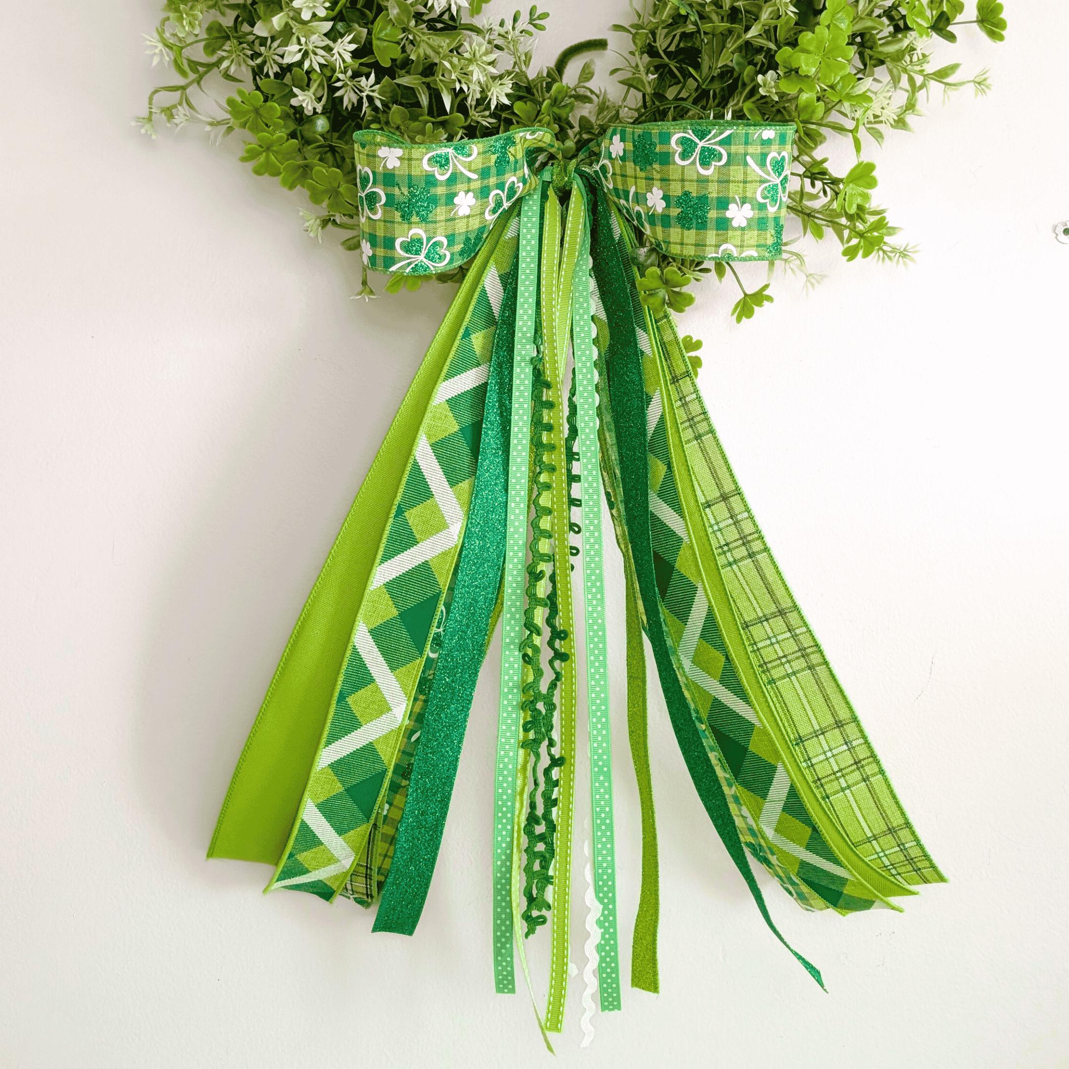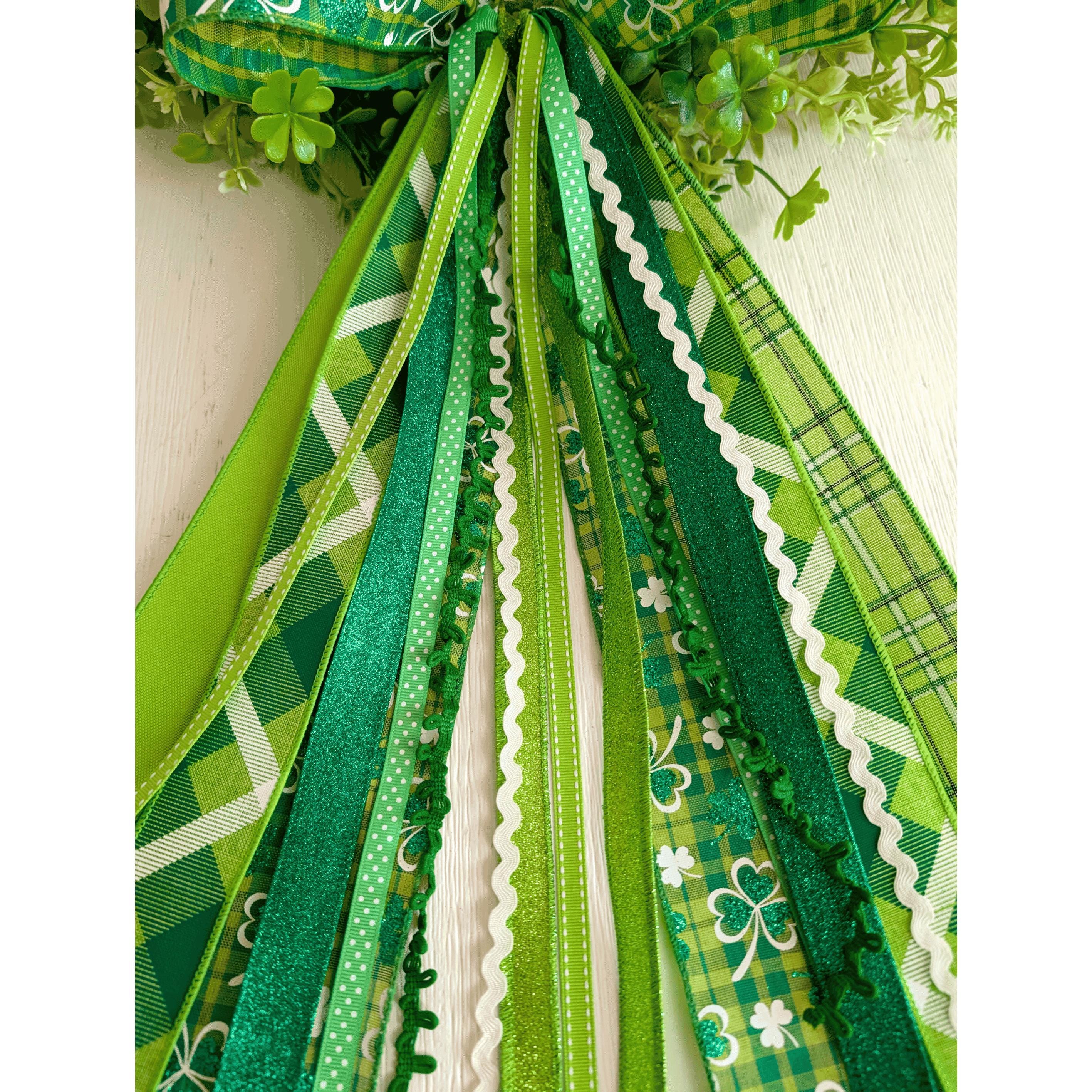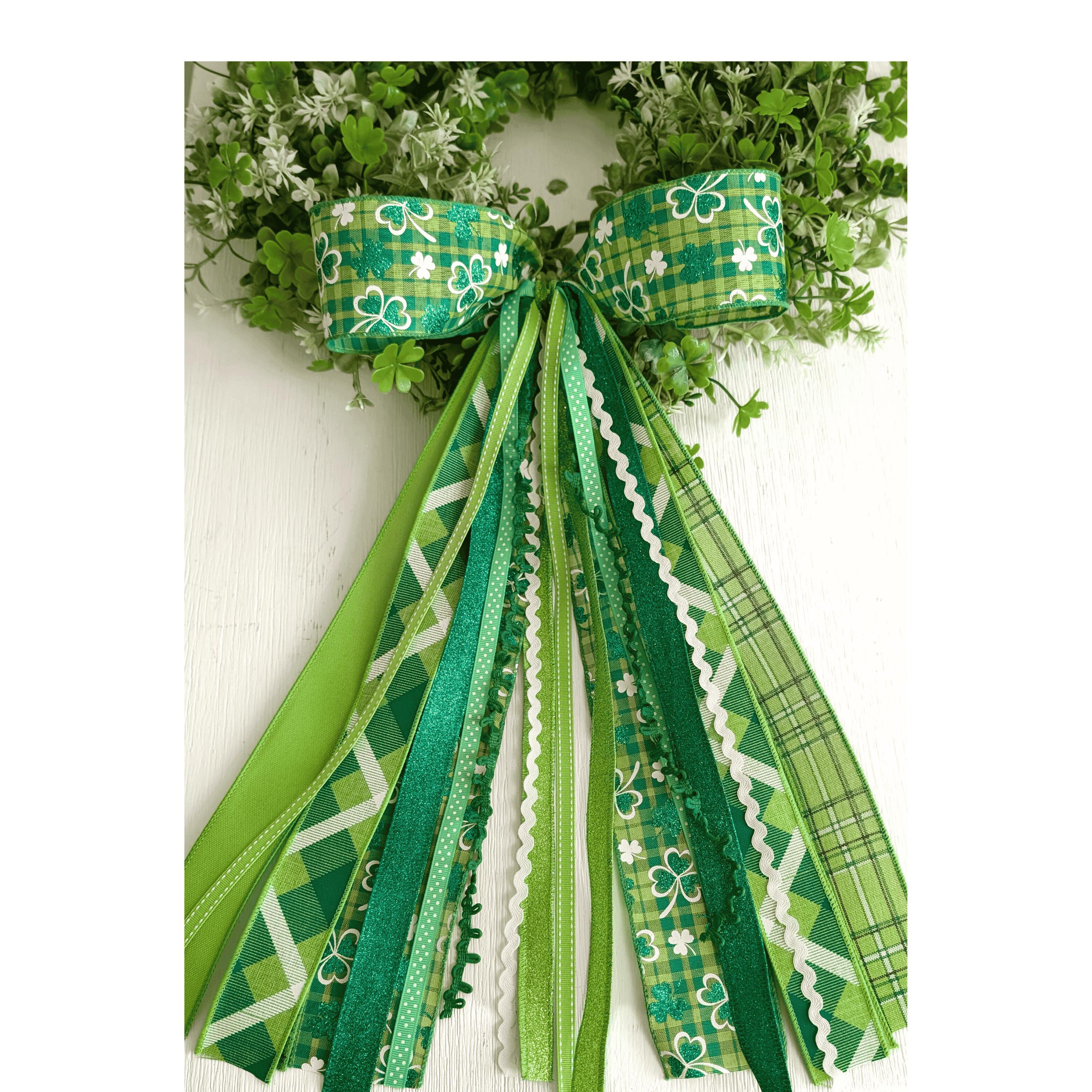 Description: The bow loops are made with 2 1/2 inch width wired ribbons. The trim tails range from 1/8inch trims and specialty ribbons, up to 2 1/2 inch.