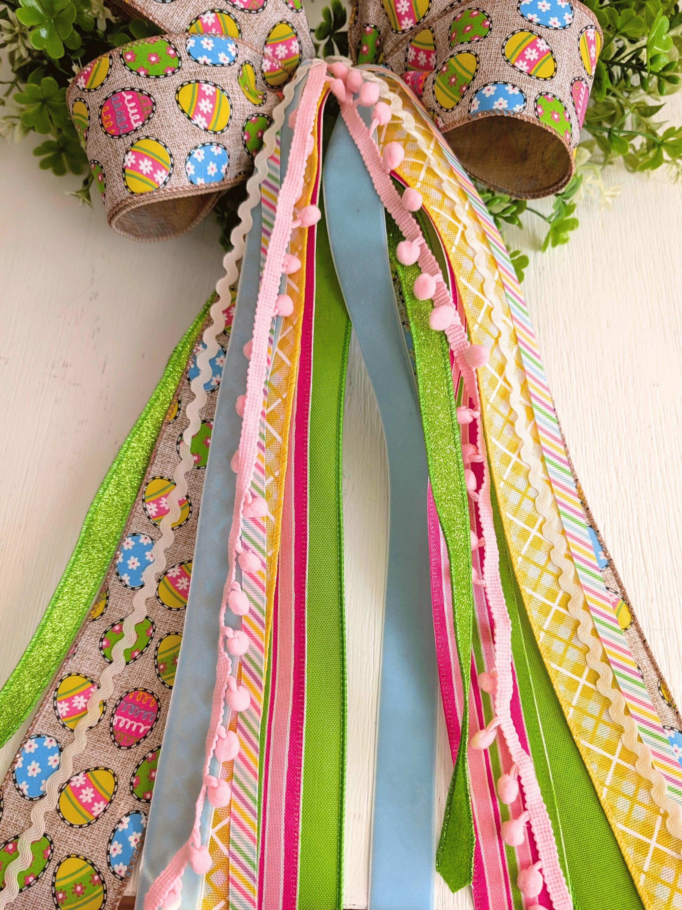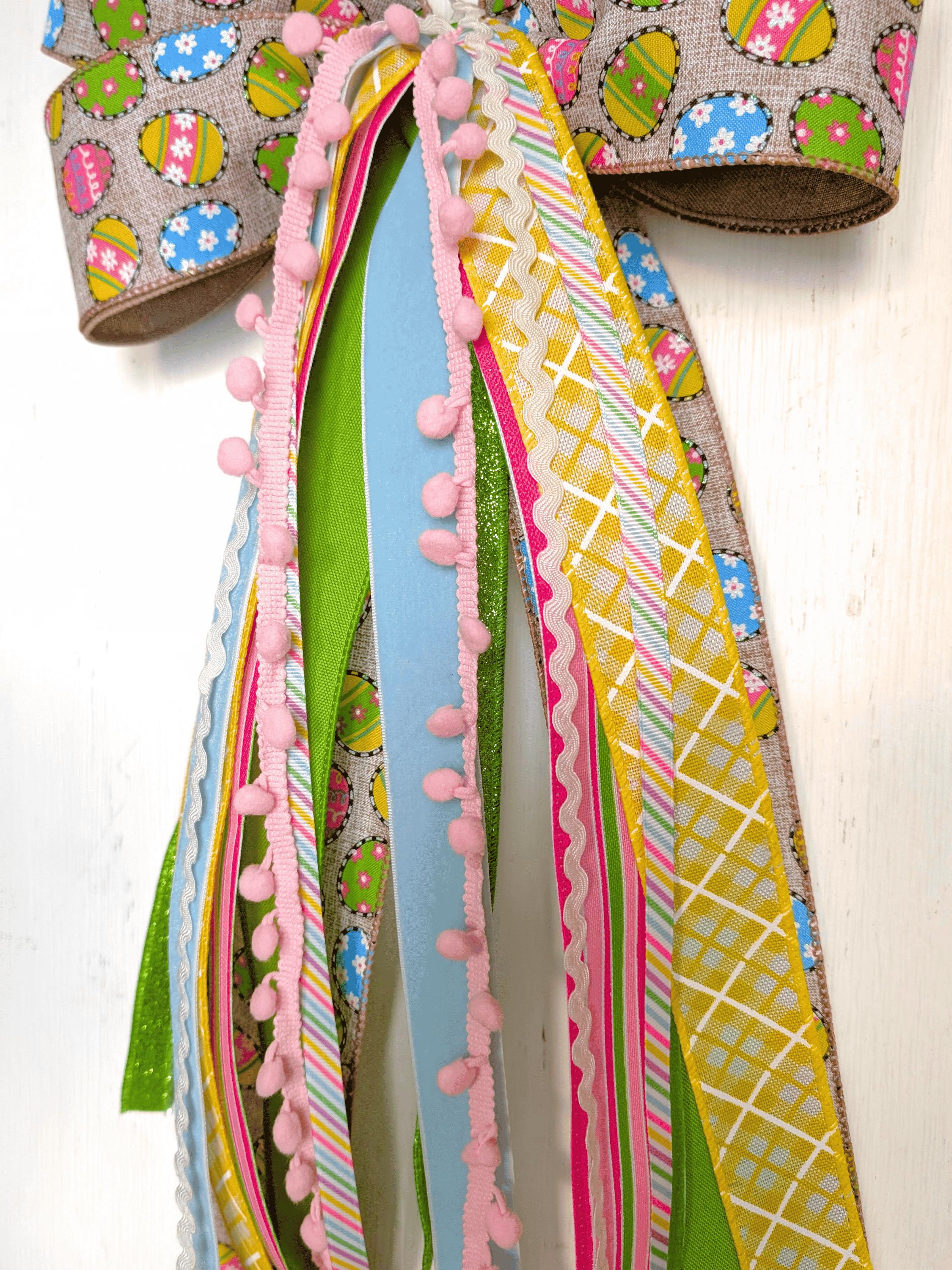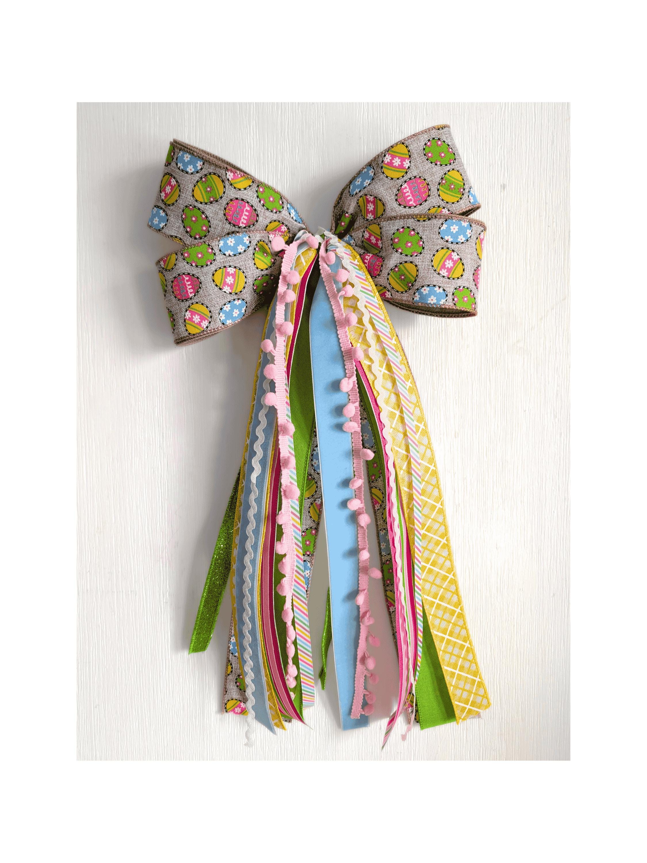 Chic and cheerful in Pink, Blue, Green, Yellow, White, and Neutrals, this Easter Egg print with trim and ribbon bundle wreath bow ships securely in a storage box and fastens with a chenille pipecleaner.
