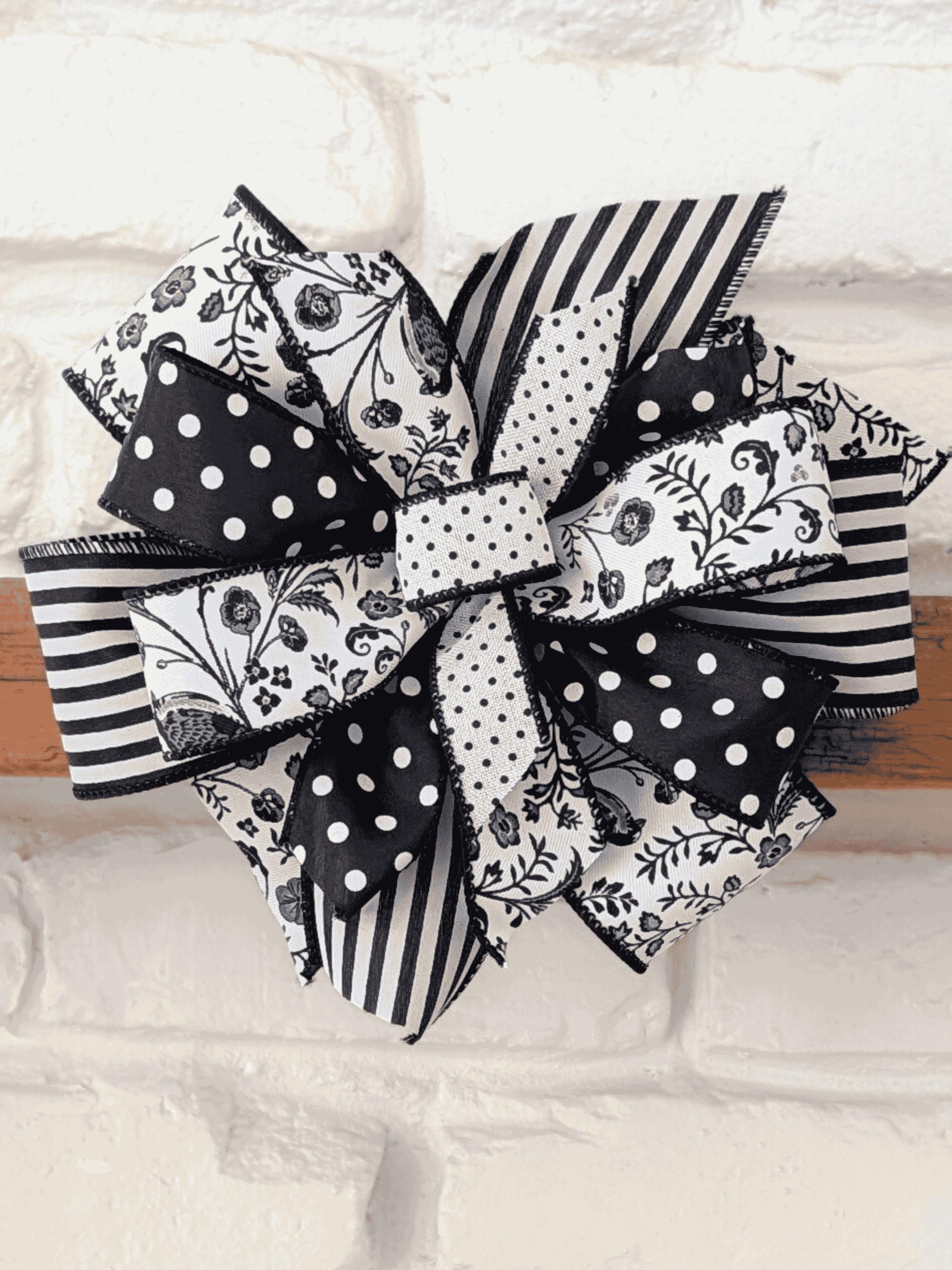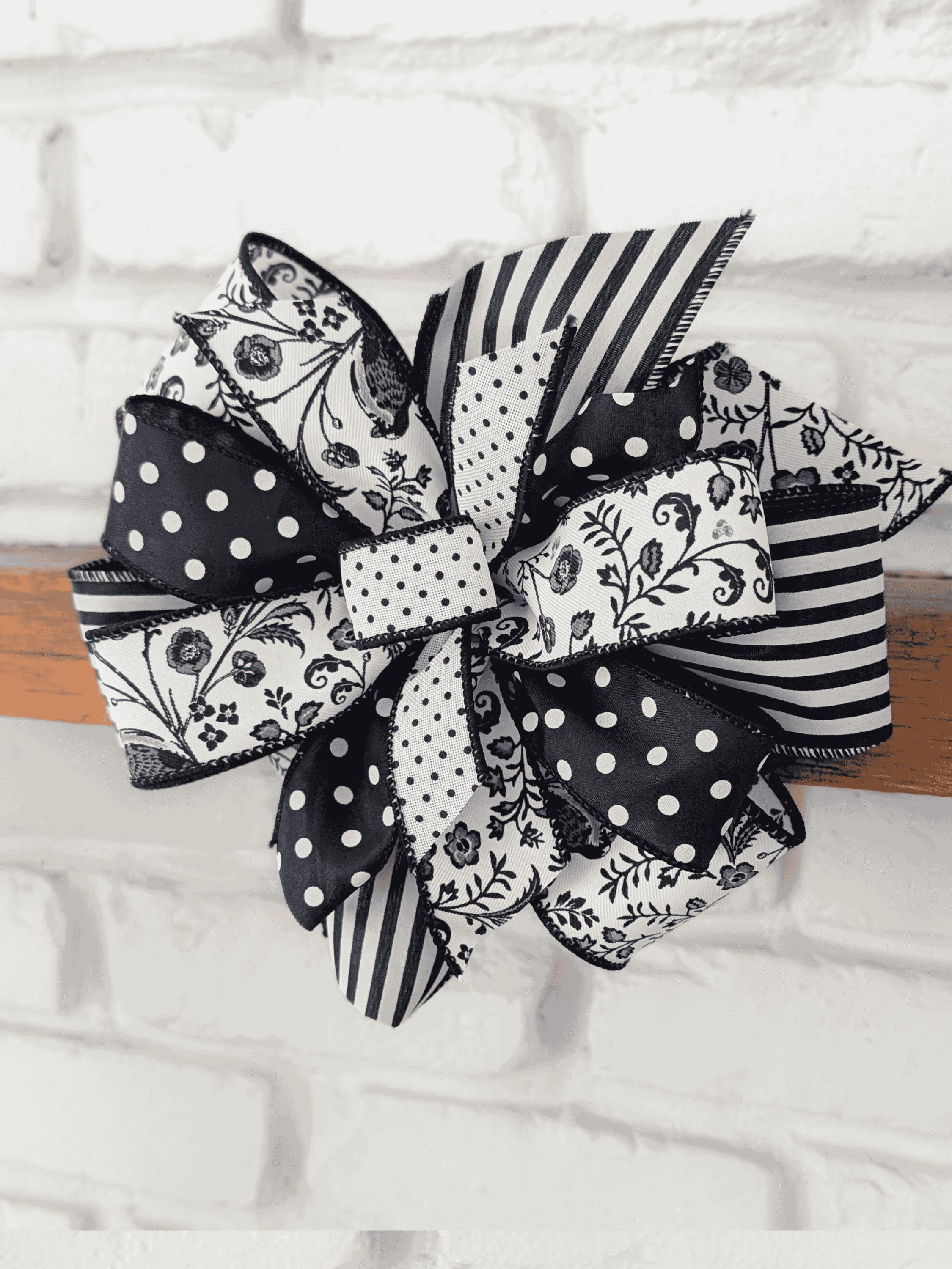 Black and white ribbons make a bold statement wreath bow, and go with everything. These fun ribbons accent toile and chinoiserie decor and can be enjoyed all year long. This everyday bold print wired ribbon in an 8x8in round bow works great on lanterns 12in and up, wreaths up to 20inches, and small to medium displays.